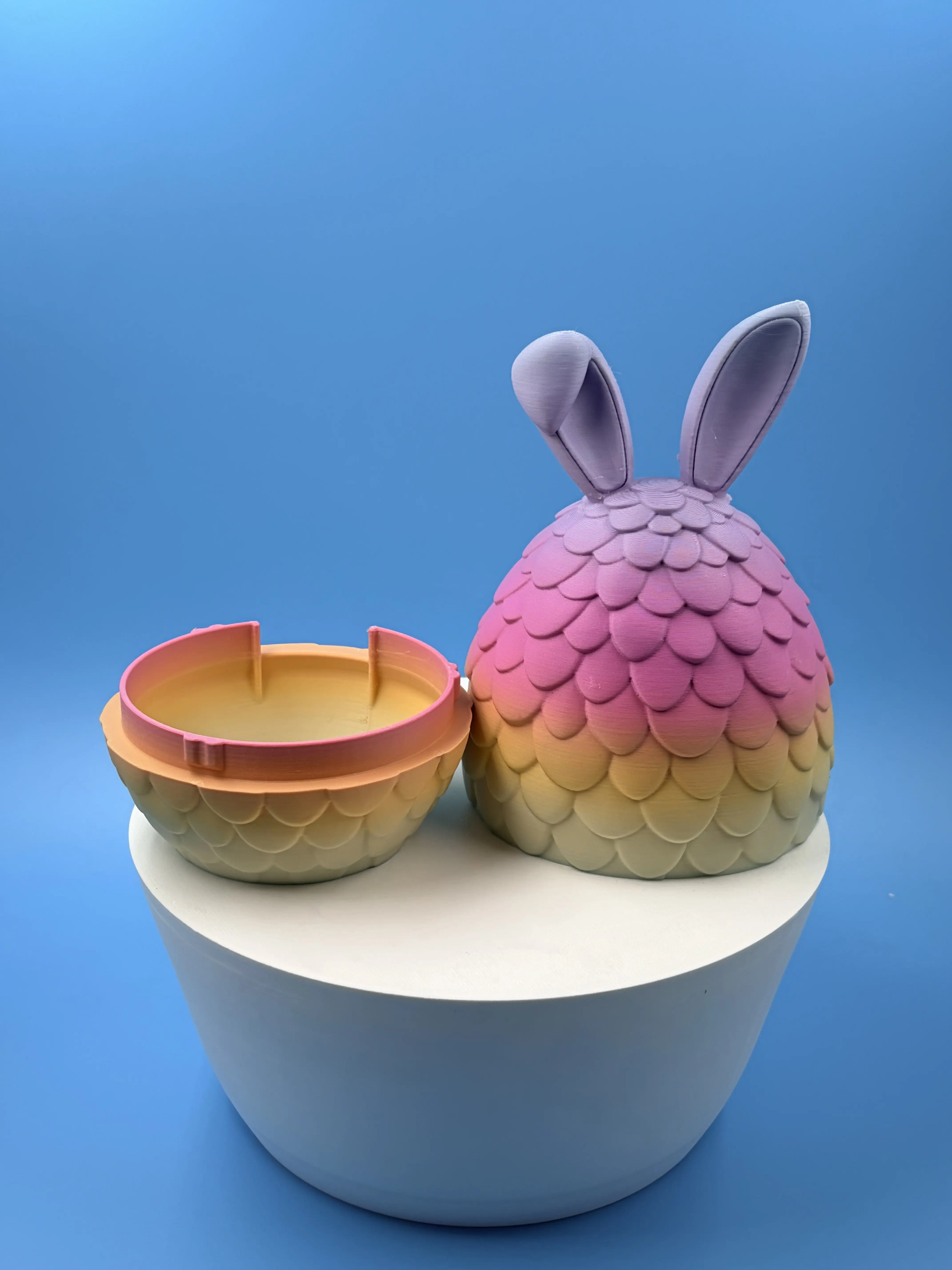 These large, openable decorative Easter eggs are a fun, reusable twist on classic Easter eggs—perfect for baskets, table decor, spring displays, and gifting. Each egg is about 8 inches tall and 3D printed with a snug open-and-close design, so you can refill them with small treats, notes, money, or tiny surprises (contents not included). We currently offer two filament options only: Matte Single-Color Rainbow or Silk Gradient (colors shift naturally throughout the print, so each egg will have a unique blend). Because these are handmade 3D printed items, you may see light layer texture and small surface variations—this is normal and part of the 3D printing process. Bundles are customizable—choose your quantity and then leave your preferred mix of egg styles in the personalization box or message me after purchase (example: “2 Floral + 1 Bunny Ears”). If no mix is provided, you’ll receive a balanced assortment in your selected filament option.