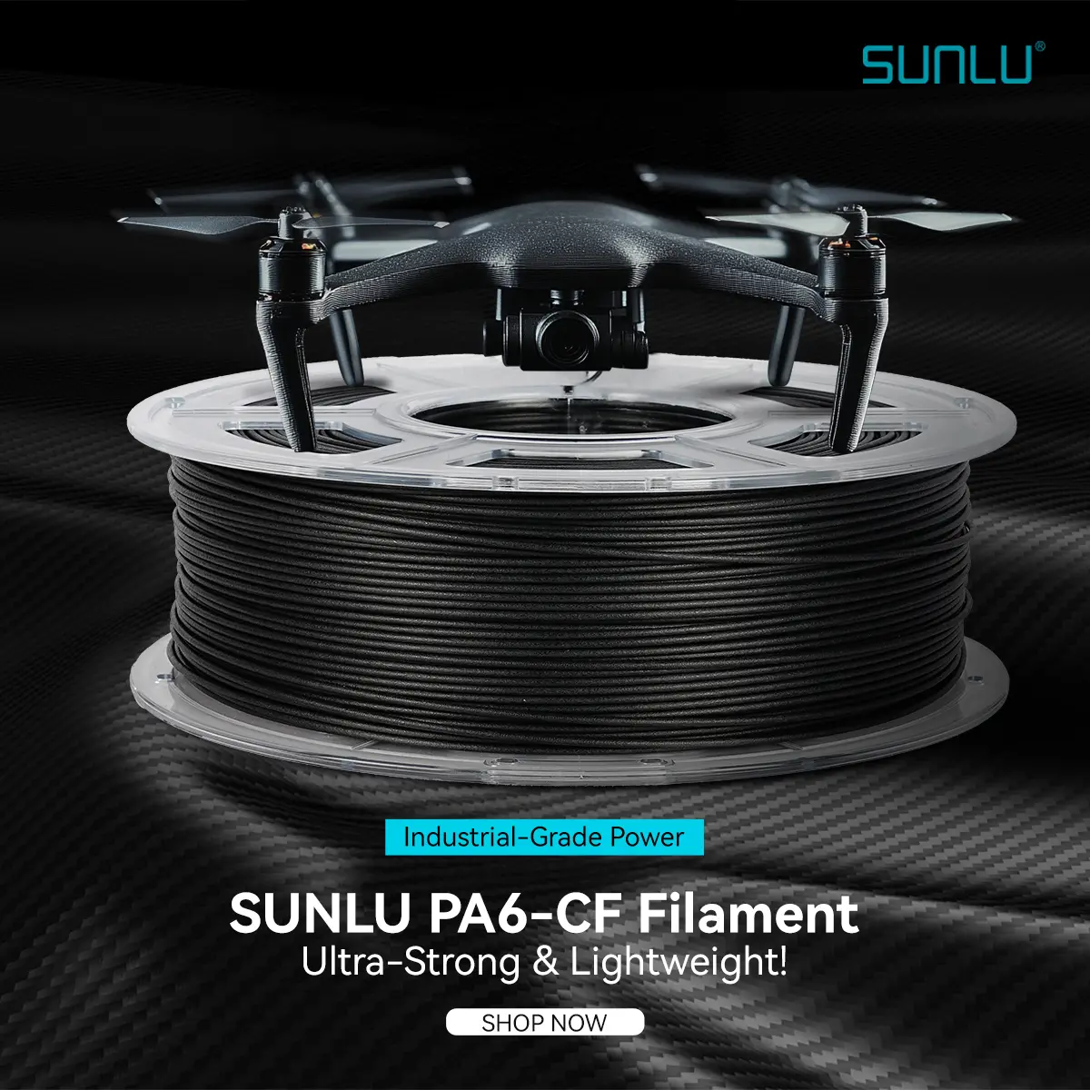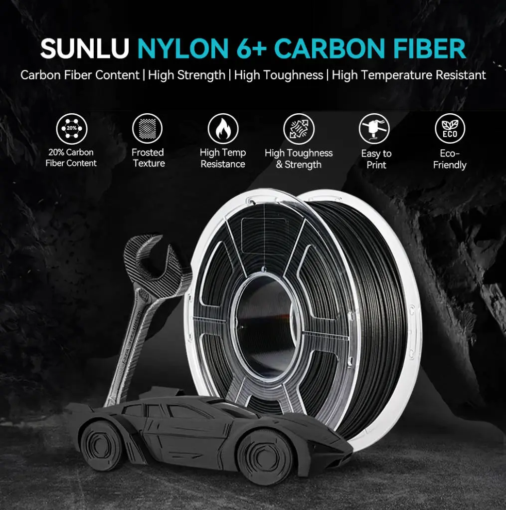 [High Strength & Heat Resistance] SUNLU PA6-CF nylon filament combines 80% PA with 20% carbon fiber, delivering remarkable stiffness, strength, and heat resistance. It offers excellent layer adhesion, making it ideal for demanding applications.
