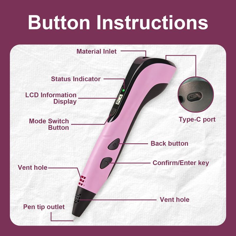 [MULTI-FUNCTIONAL] The Pen is temperature adjustable to accommodate multiple types of filament: PLA (160-210℃, 320-410°F) or ABS (210-235℃, 410-455°F)