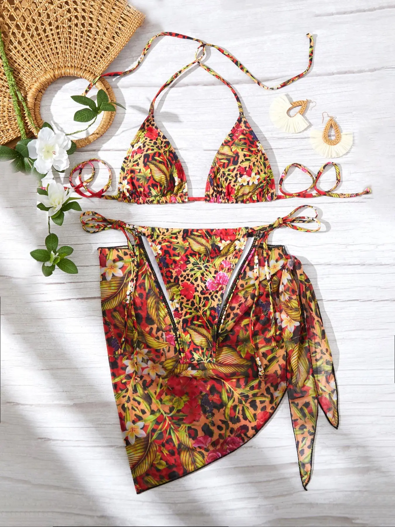 Women's 3pcs Tie Back Bikinis Set, Halter Triangle Swim Top & Tie Side Swim Bottom & Cover Up Skirt Set, Summer Beach Holiday Vacation Swimwear Set for Women, Floral Print Swimsuits