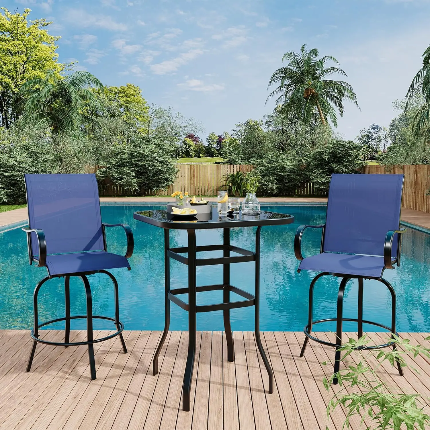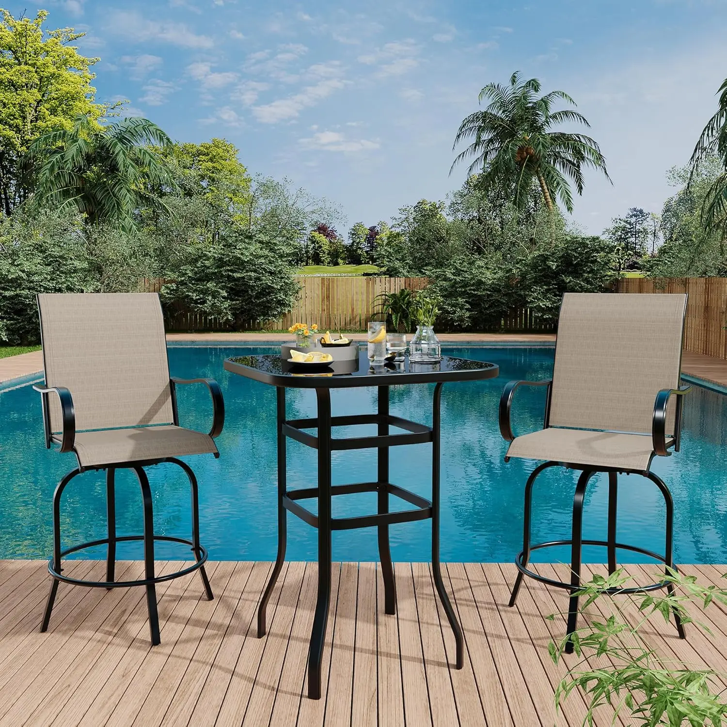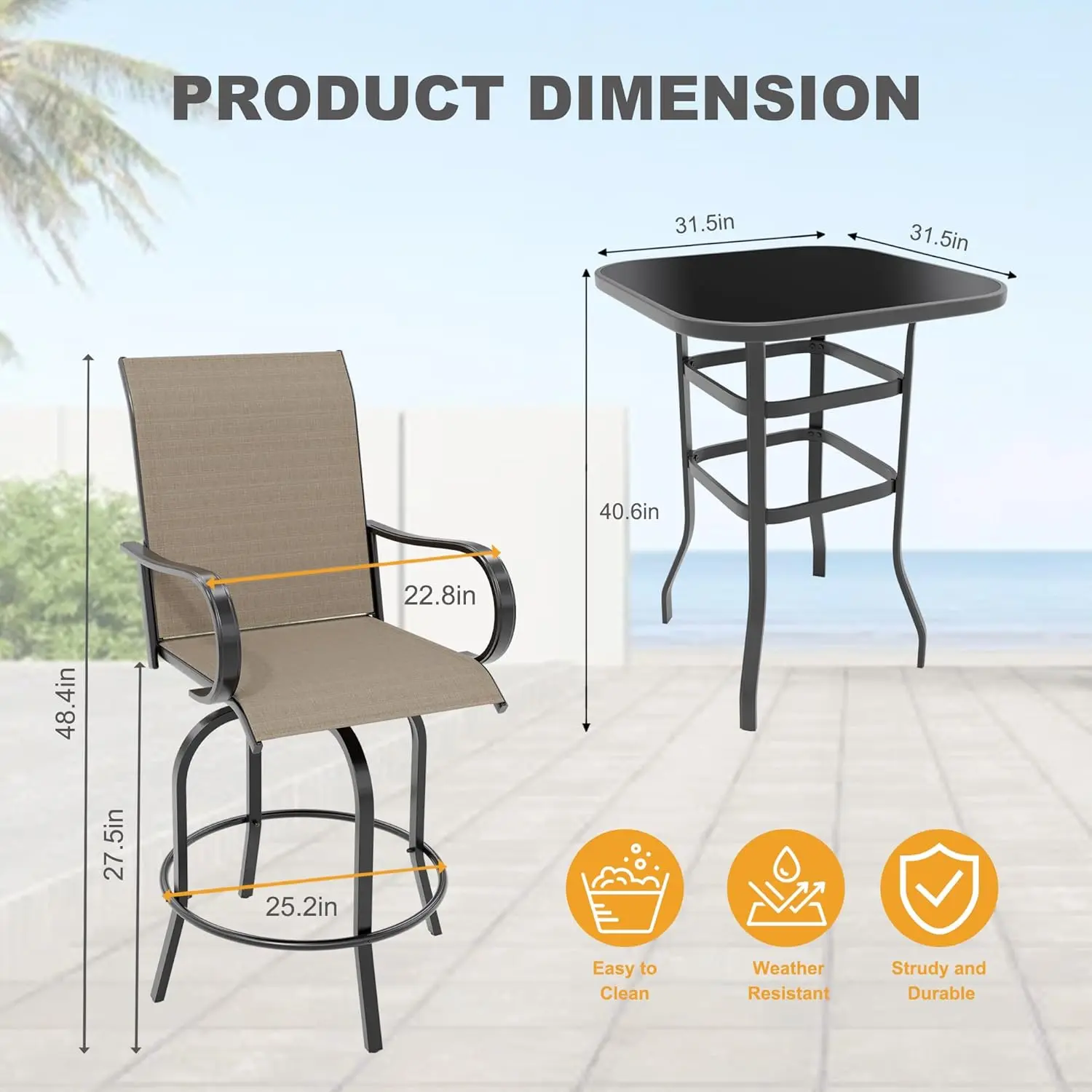 PATIO BAR CHAIRS - This 3 pcs patio swivel bar sets adds a modern touch to any outdoor space. The high top patio table and chairs are ideal for social gatherings, parties, or quiet evenings They are perfect for indoor areas, as well as outdoor gardens, parks, patios, porches, poolside areas, and yards