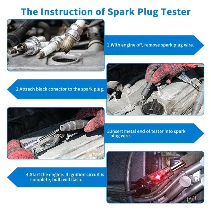 Convenient Operation : 1. Shut off the engine and remove the spark plug wire; 2. Connect the black connector to the spark plug; 3. Insert the metal end of the tester into the spark plug wire; 4. Start the engine and observe the indicator light; The time required for all internal combustion engine troubleshooting is approximately 20 seconds