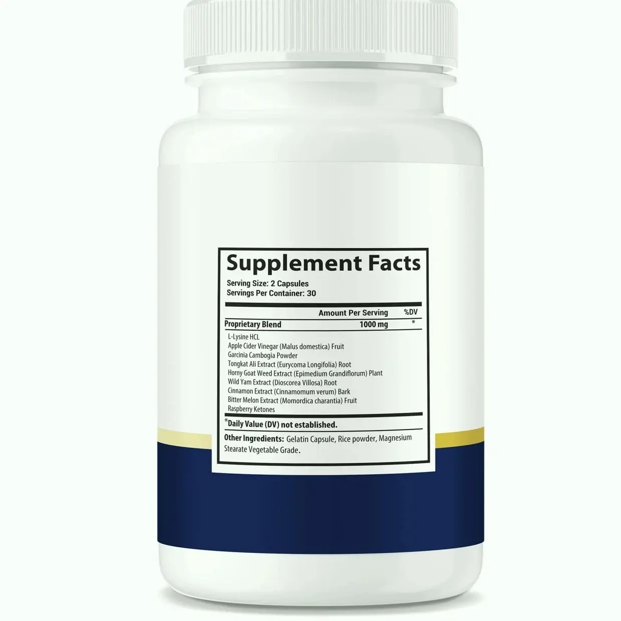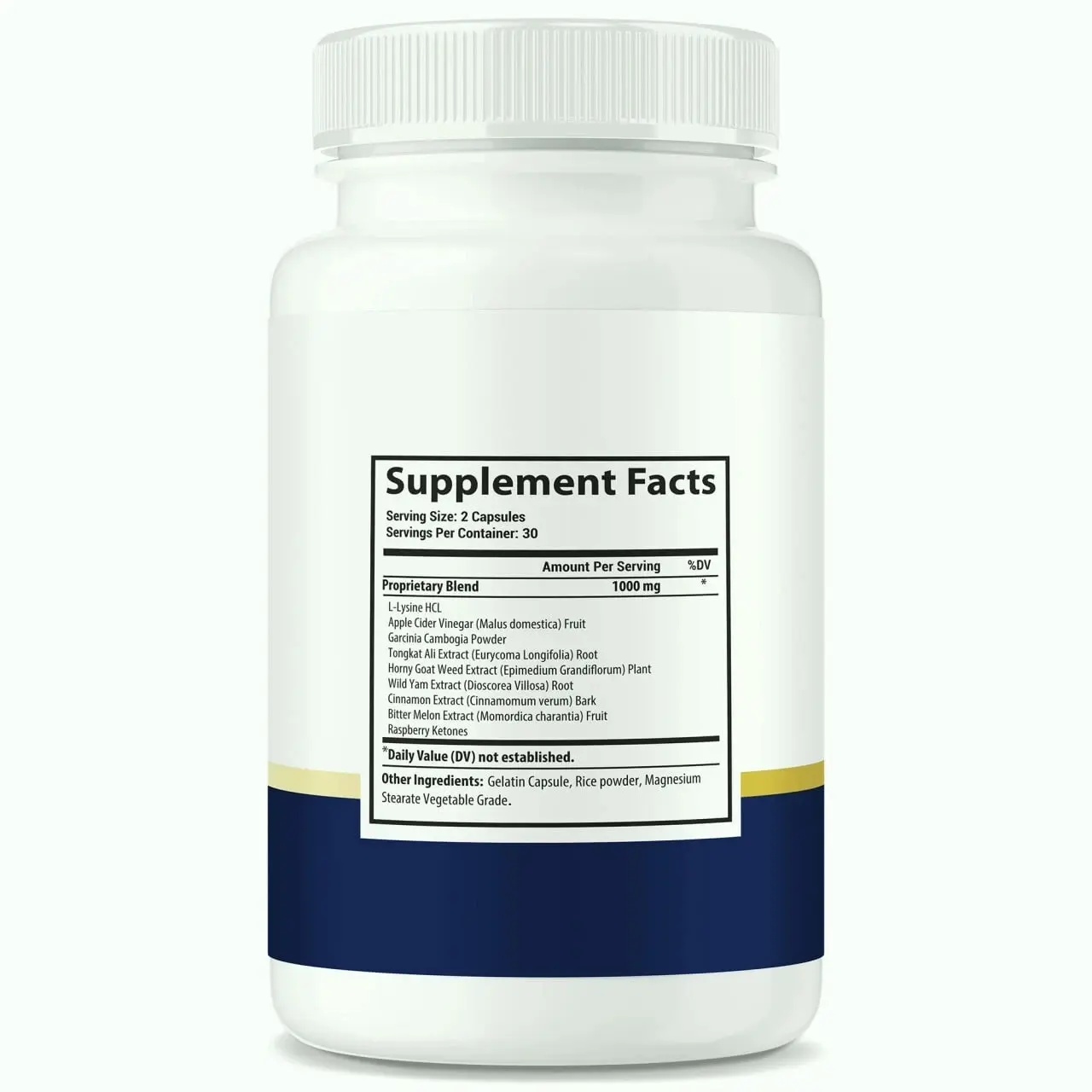 Proprietary Blend: 1000 mg L-Lysine HCL Apple Cider Vinegar (Malus domestica) Fruit Garcinia Cambogia Powder Tongkat All Extract (Eurycoma Longifolia) Root Horny Goat Weed Extract (Epimedium Grandiflorum) Plant Cinnamon Extract (Cinnamomum Verum) Bark Wild Yam Extract (Dioscorea Villosa) Root Bitter Melon Extract (Momordica Charantia) Fruit Raspberry Ketones Other Ingredients: Gelatin Capsule, Rice Powder, Magnesium Stearate Vegetable Grade
