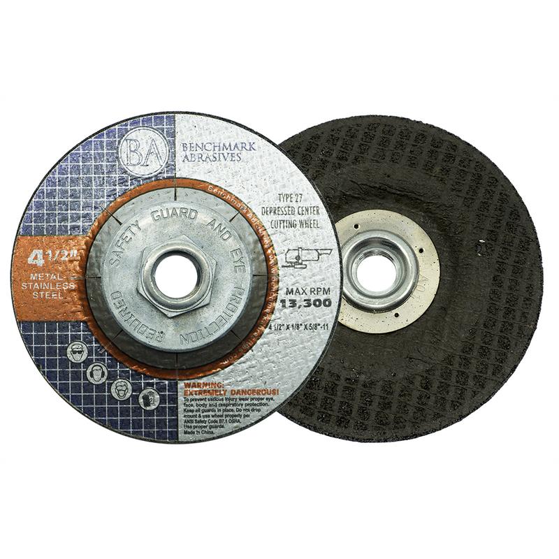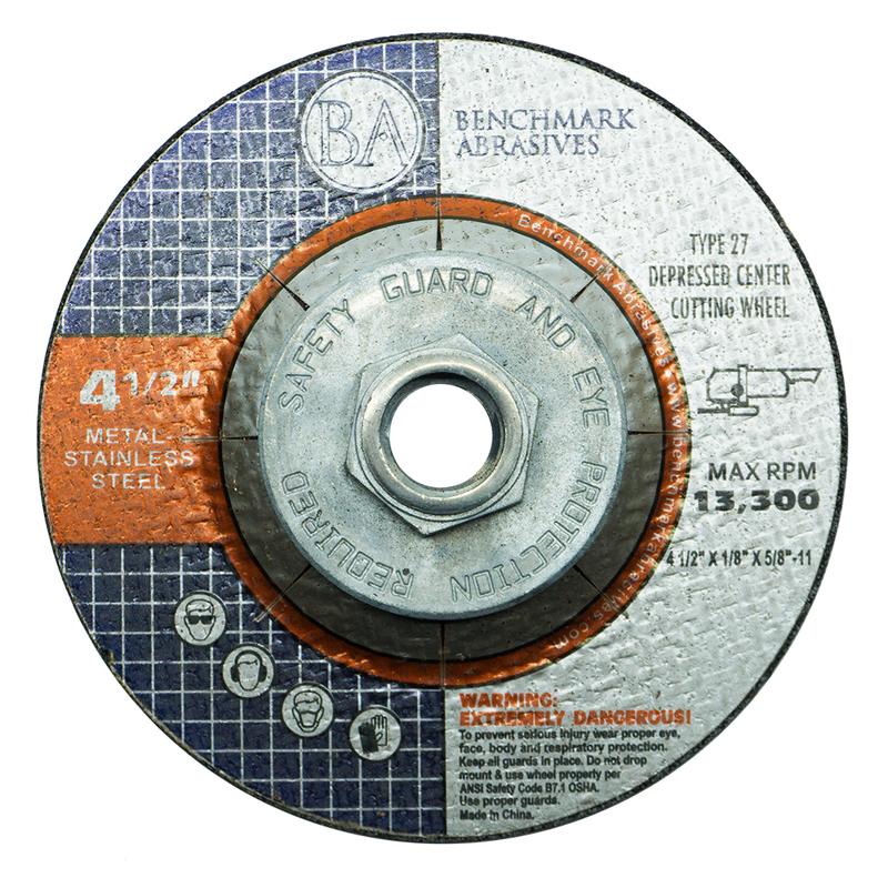 4-1/2" x 1/8" x 5/8"-11 T27 Pipeline Wheel are suitable for general purpose cutting, notching & light grinding of stainless steel, carbon steel, and other ferrous metals. The cutting grinding wheel is designed and manufactured to perform both cutting and light grinding. The 5/8”-11 hub allows for easy spin-on spin-off action.