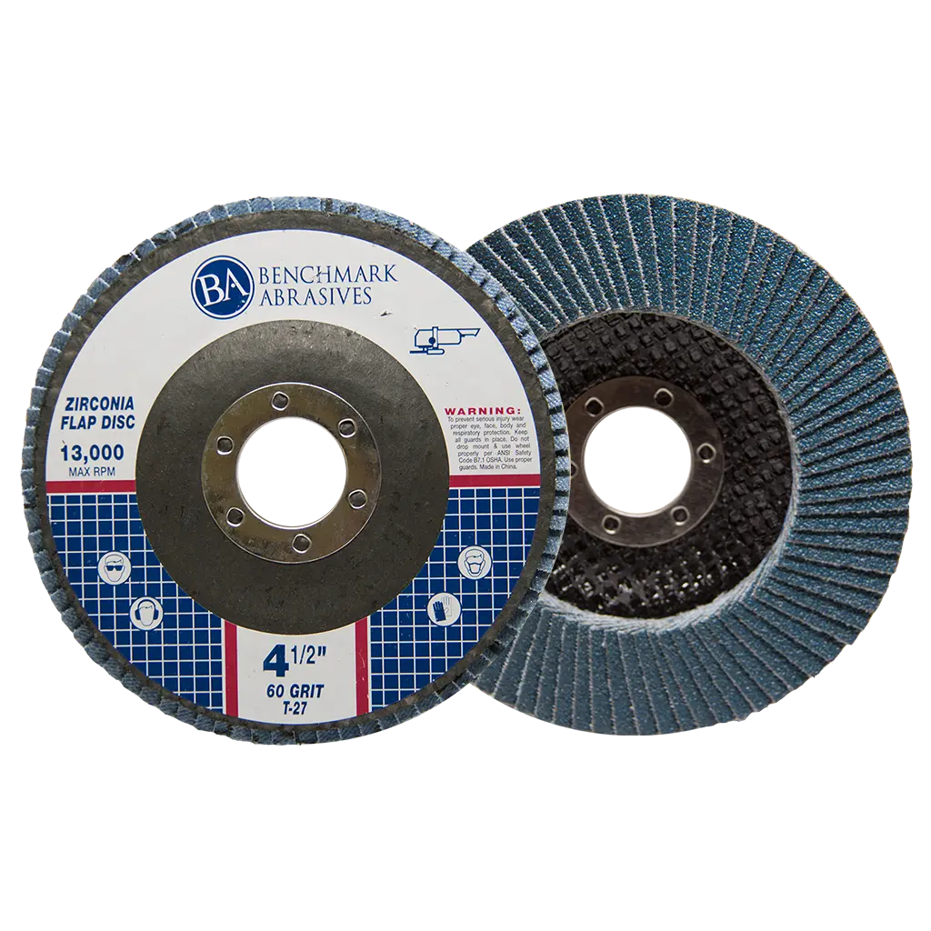 4-1/2" x 7/8" T27 (Flat Face) Zirconia Flap Discs are manufactured using European zirconia cloth. The European material is superior due to its uniform particle size and premium blend of ingredients. These discs exceed other flap discs by packing 25 to 50% more abrasives on each snippet (compared to the competition). In addition, all discs are manufactured on computer-controlled machines and subject to numerous tests which ensure high quality and greater safety.