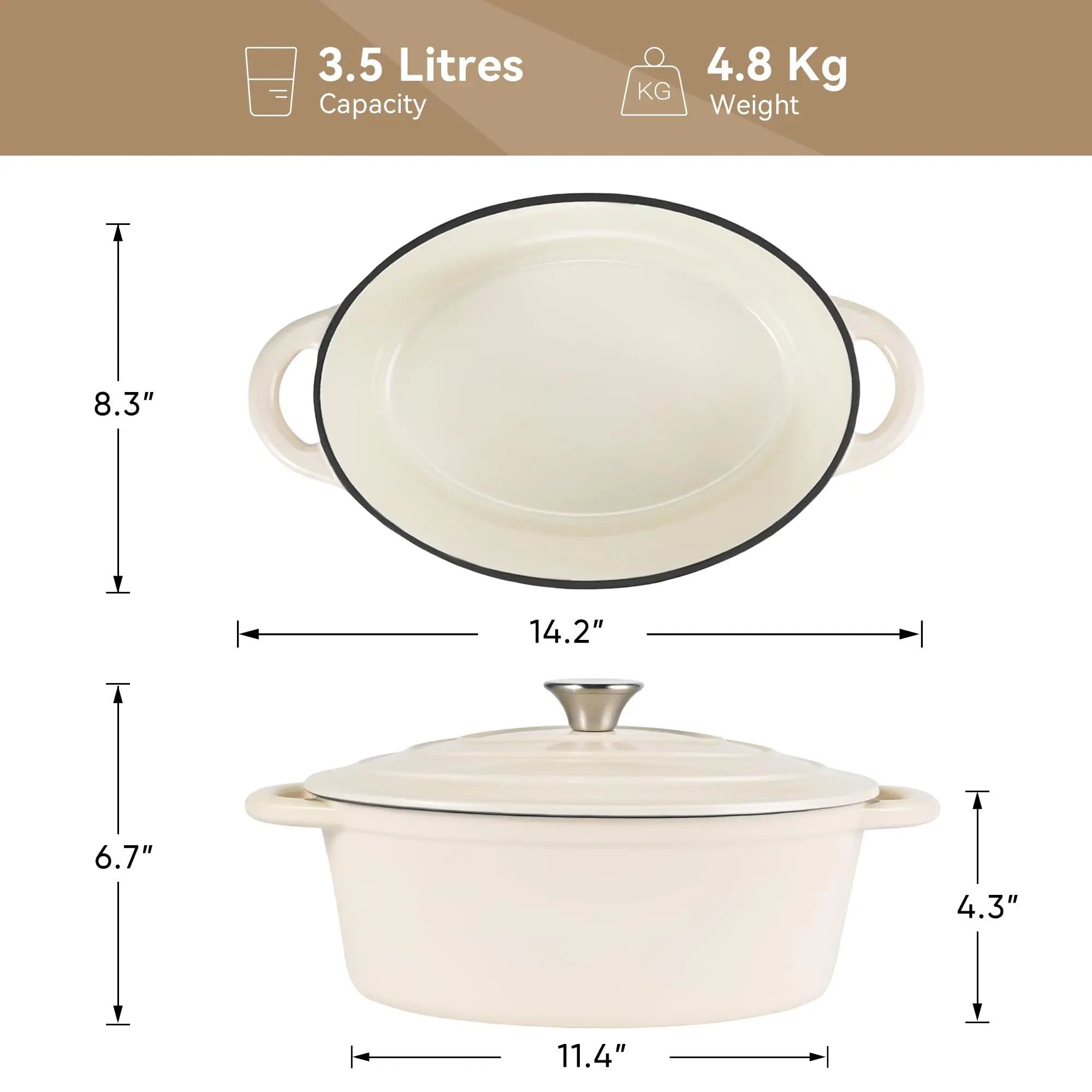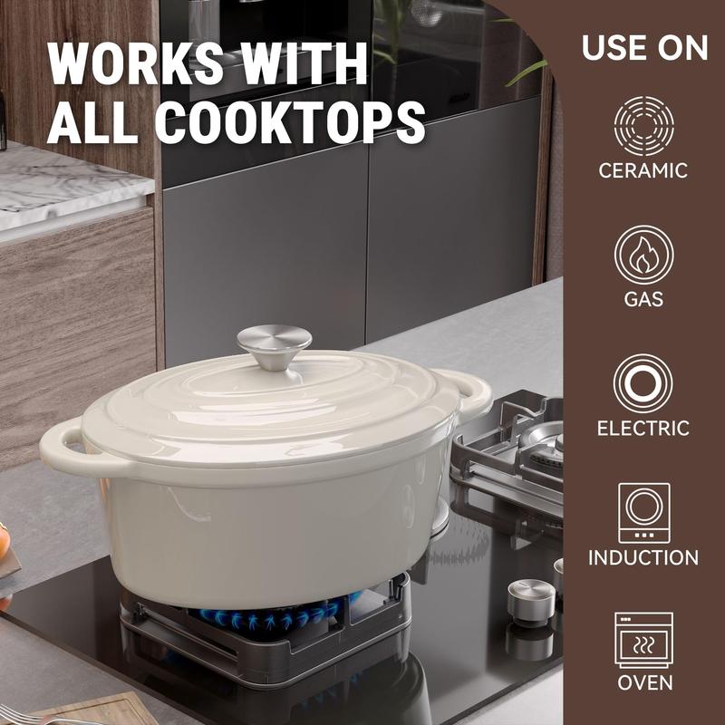 ·LARGE 4.5-QT CAPACITY: The oval dutch oven with a diameter of 11.4 inches and a capacity of 3.5 liters meets all the needs of daily stewing, don't worry about even family gatherings. It can be used in various cooking methods, such as stewing, cooking, baking, etc.The highest temperature tolerance is as high as 500°F.