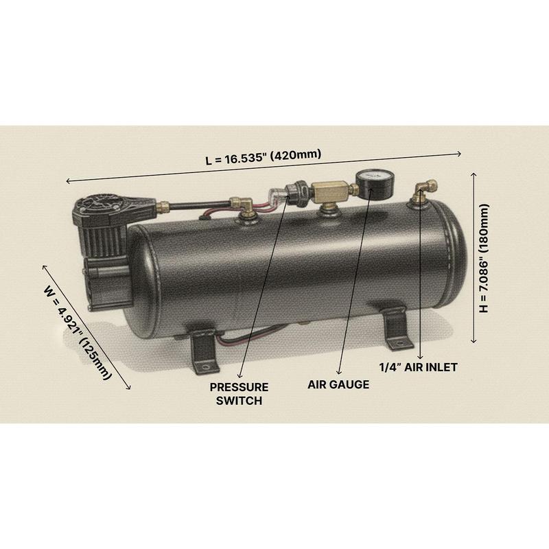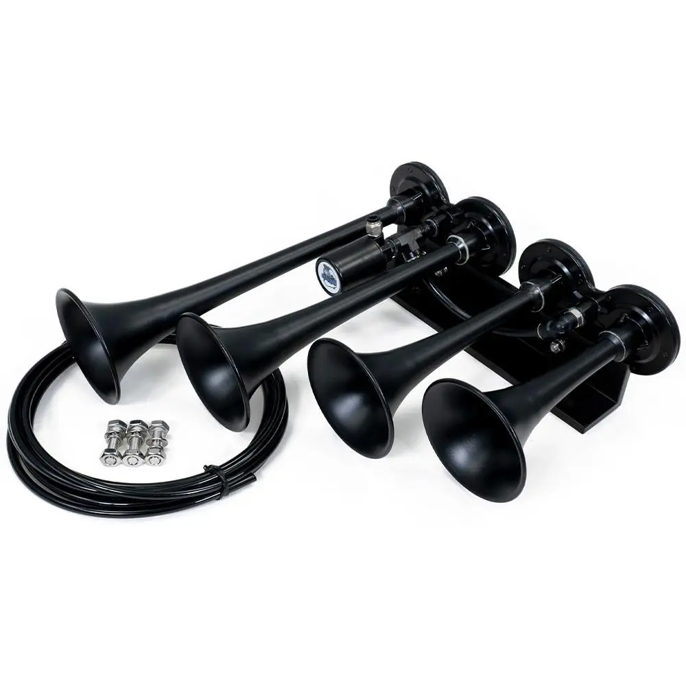 At the heart of this thunderous kit is a Rage 4-Chime Air Horn that boasts a pre-installed 1/4" air valve, ready to accept the included 1/4" air line, ensuring a hassle-free connection. The air source unit comes pre-plumbed and pre-wired, featuring a pre-attached air pressure gauge and pressure switch, making the installation process as straightforward as it gets.
