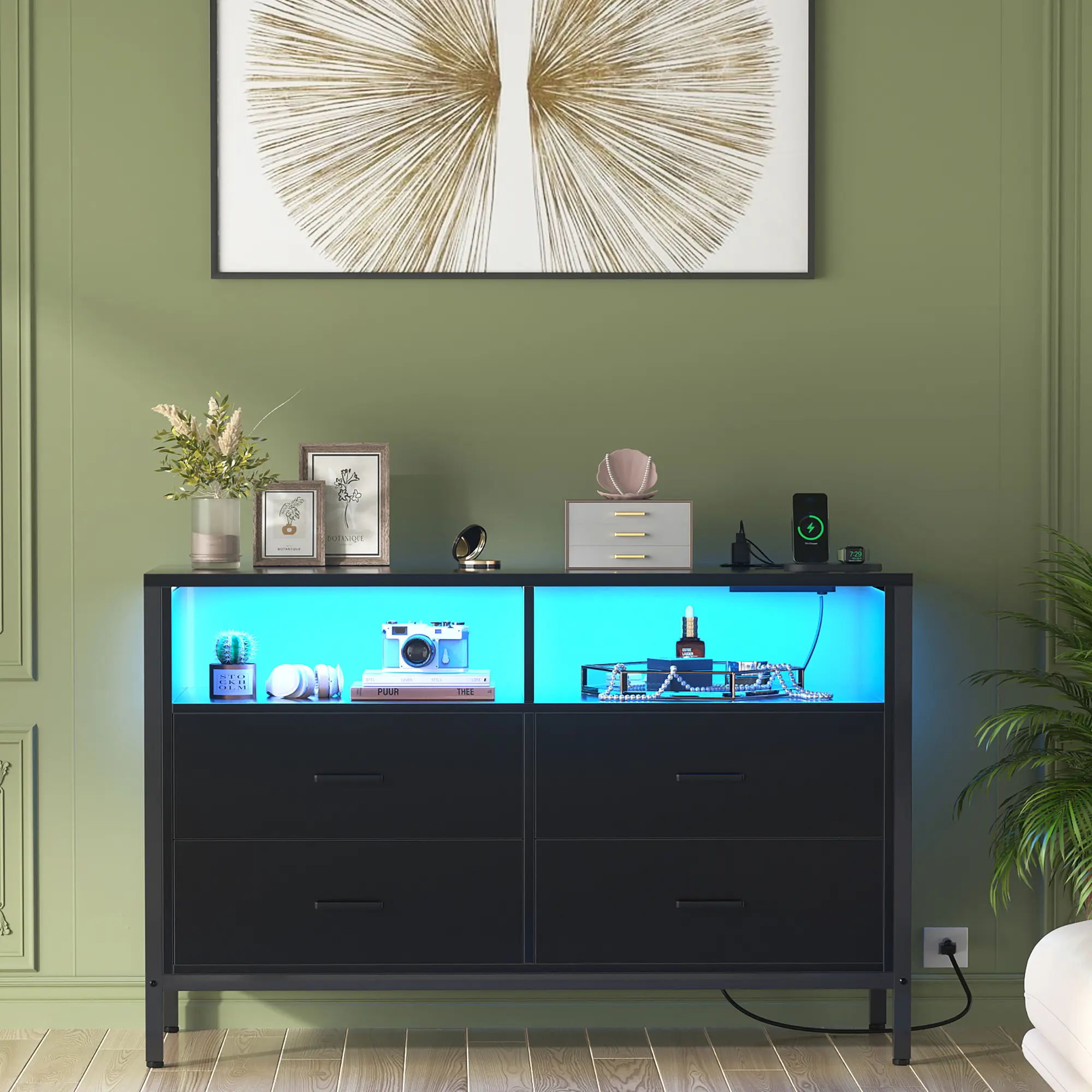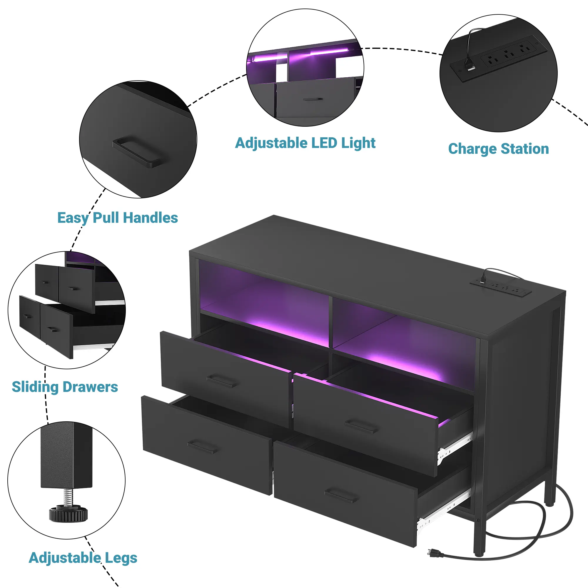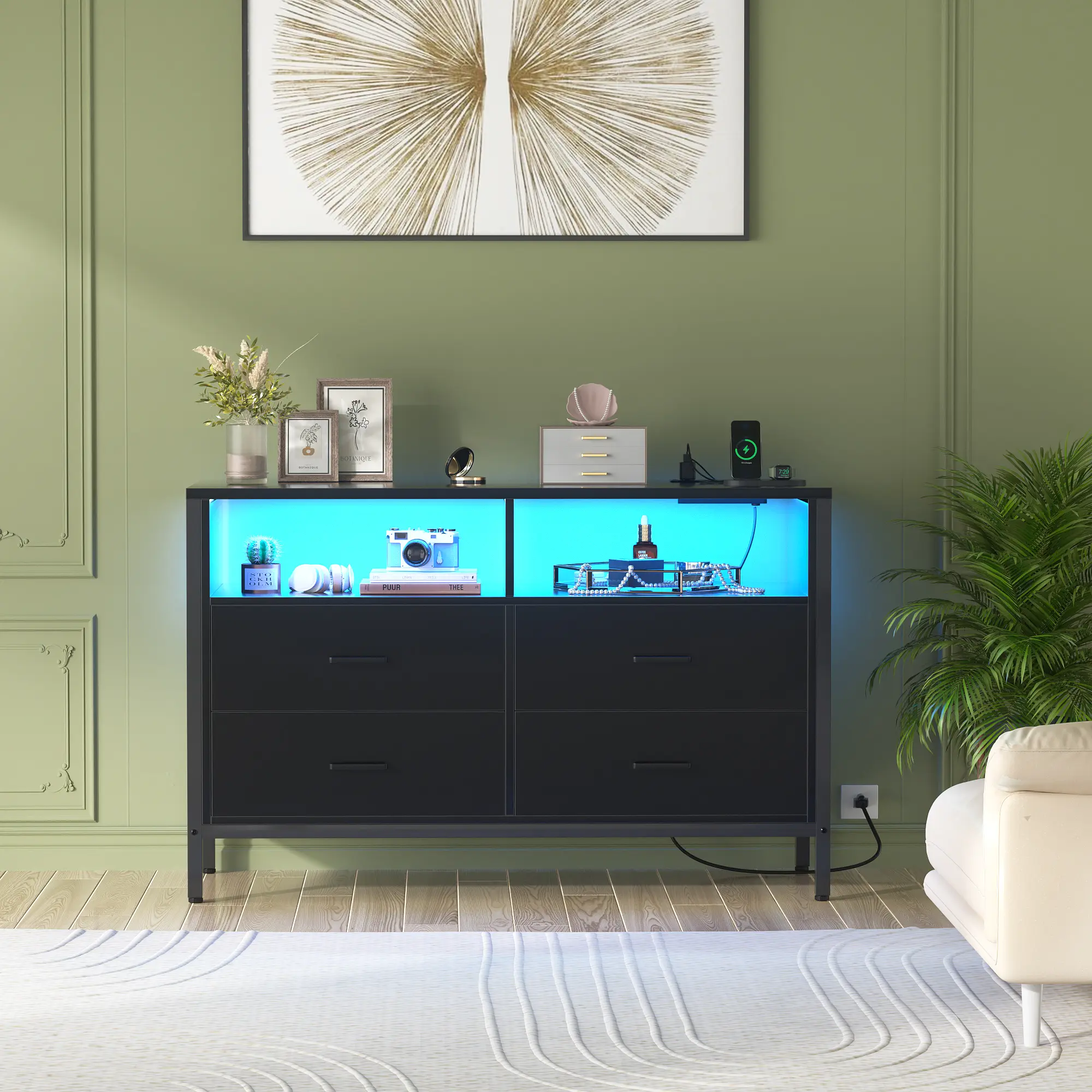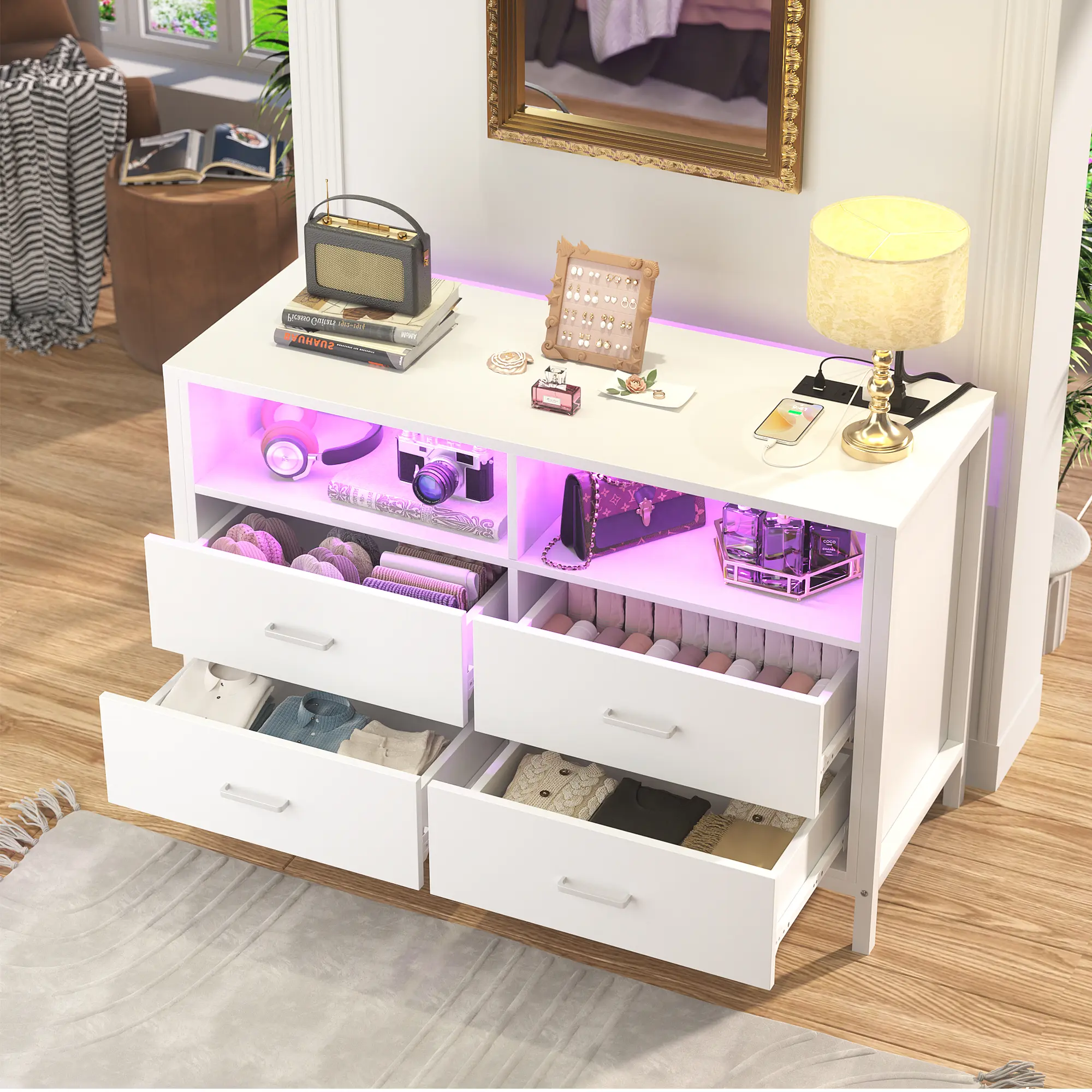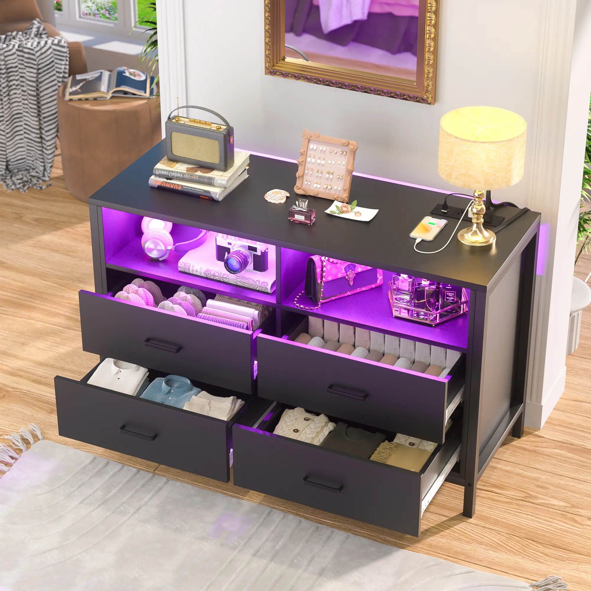 Our contemporary dresser features a smart LED light strip, offering a modern touch to a classic design. With access to 60,000 colors and 29 dynamic modes, you can customize the lighting to suit any mood. This dresser combines style and functionality, enhancing your room's ambiance.