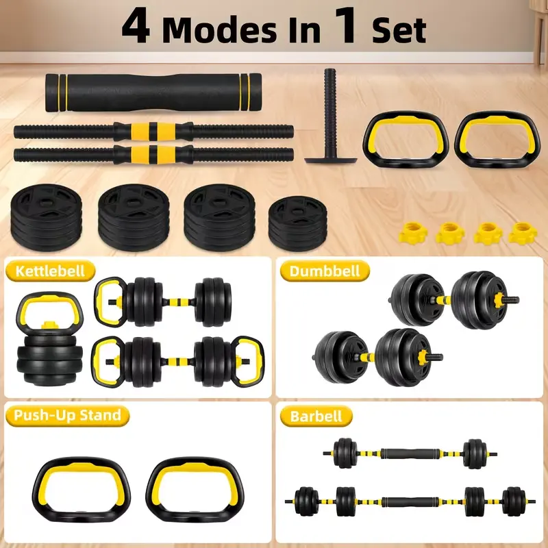 This 4-in-1 set includes 70 lbs of free weights, perfect for home fitness workouts. It features a curved bar connector, suitable for both men and women. Ideal for versatile exercises, this set enhances your workout routine.