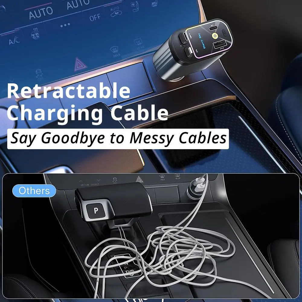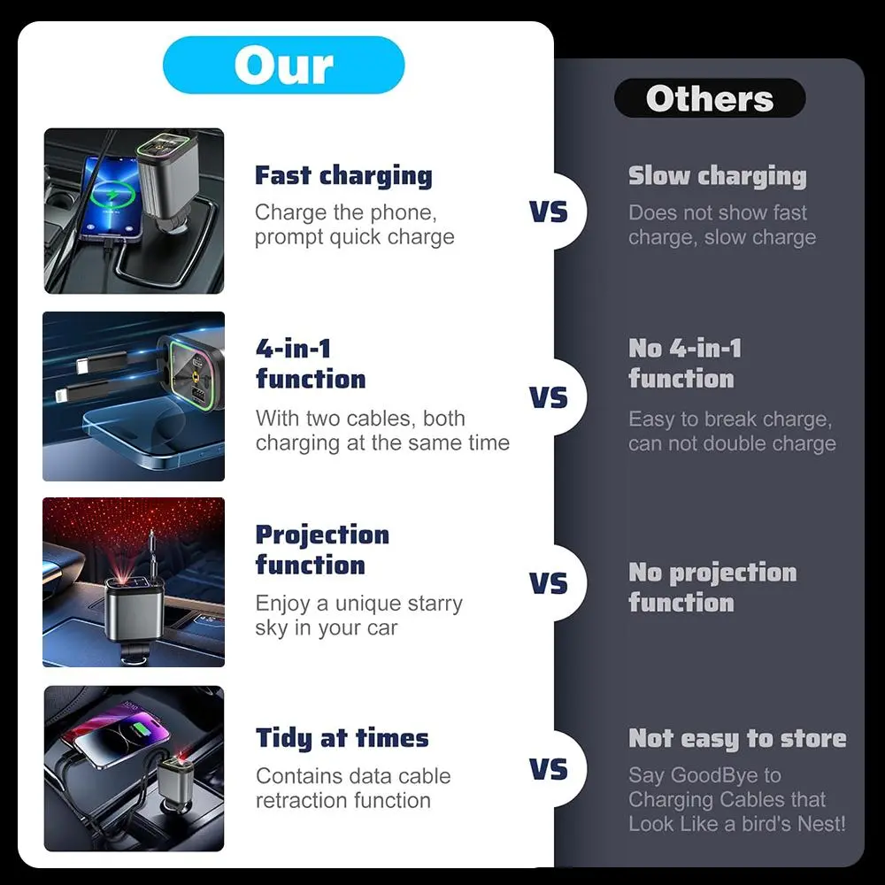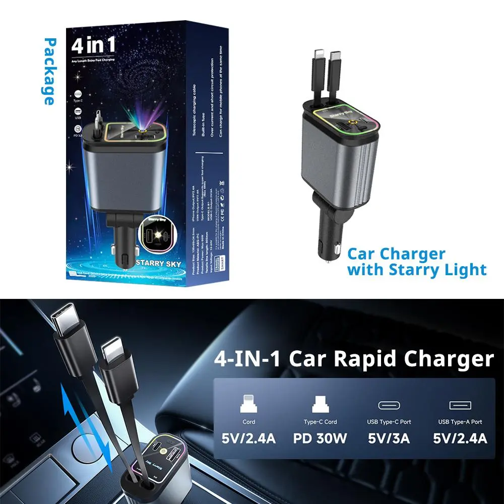 4 in 1 Car Charger, Retractable Car Charger, Dual Type C & Lightning Cable Car Charger, Universal Car Charger for iPhone 15/14/13 Pro Max & Samsung Galaxy S23