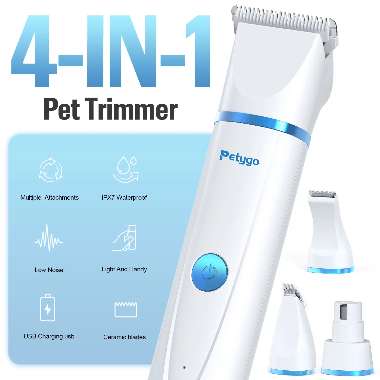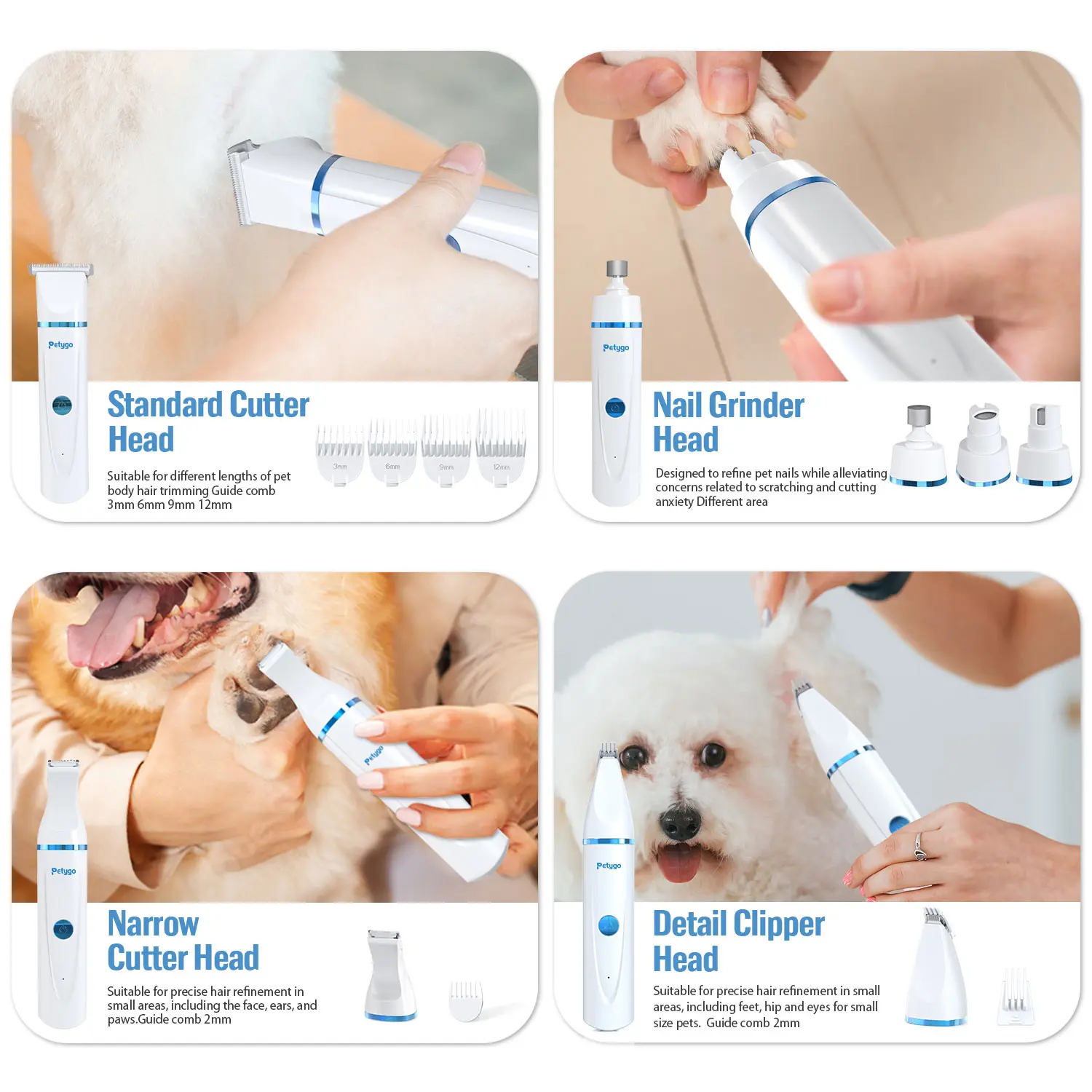 ·【4-in-1 Dog Grooming Kit 】Petygo dog hair clippers include 2 trimmer heads (normal/detail)and 1 nail grinder, if you are looking for a grooming tool for your dog, cat or other furry baby,this pet nail clippers have everything you need for full body clipping and nail sharpening.