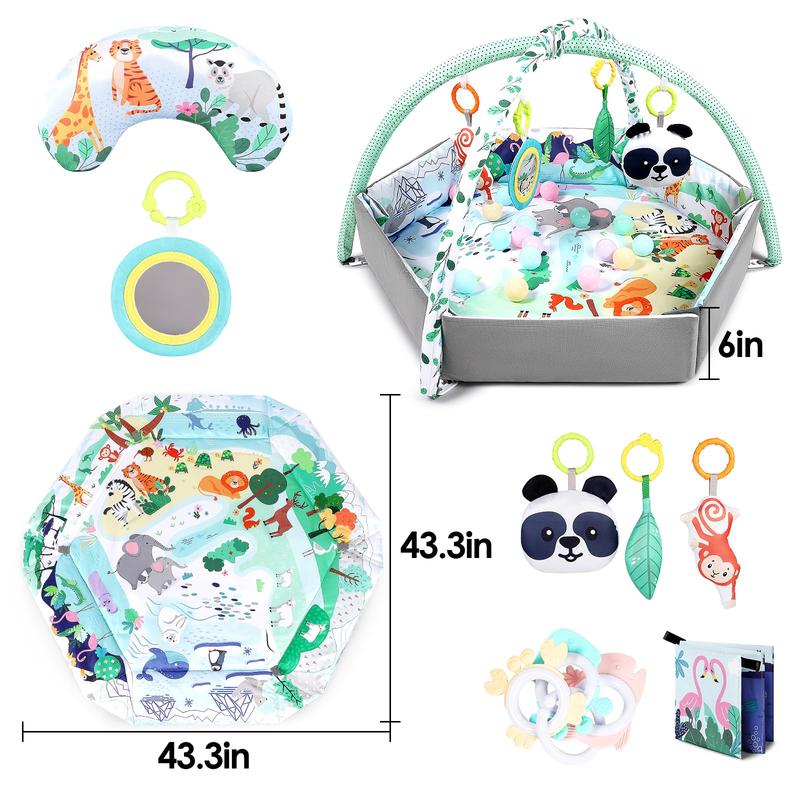 This versatile baby activity play mat is perfect for newborns. It features 6 infant learning sensory toys, enhancing motor skill development. The mat includes a toddler ball pit with 18 ocean balls, making playtime fun and engaging. Ideal for tummy time, it promotes baby's development.