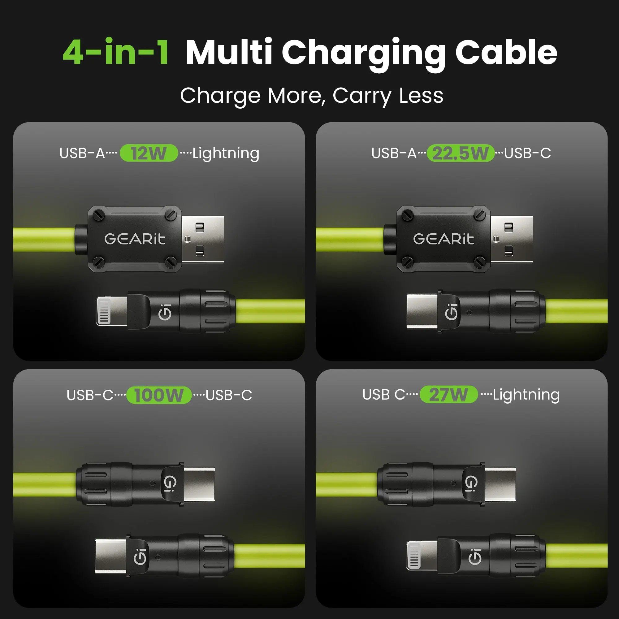 Β·One Cable Rules Them All - The revolutionary design of our 100w 4 in 1 USB charging cable with twist-and-lock connectors eliminates cable clutter, seamlessly adapting to charge USB-A, USB-C, and Lightning-compatible devices.