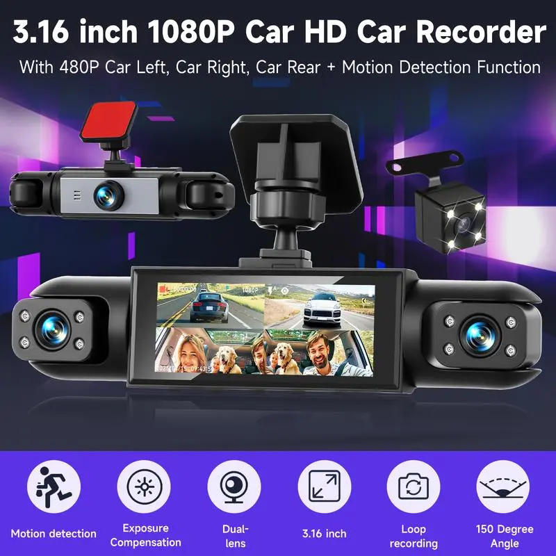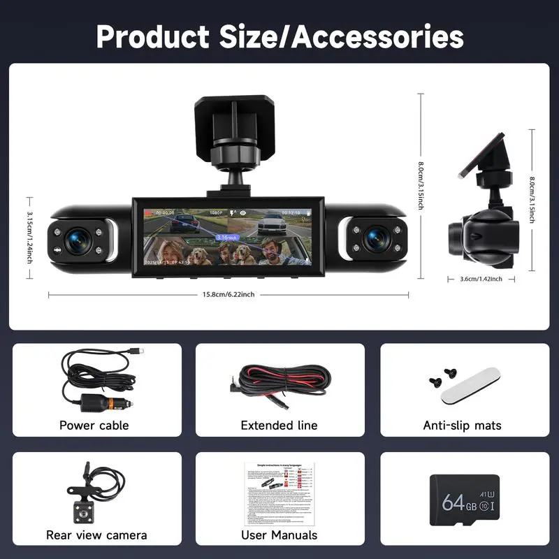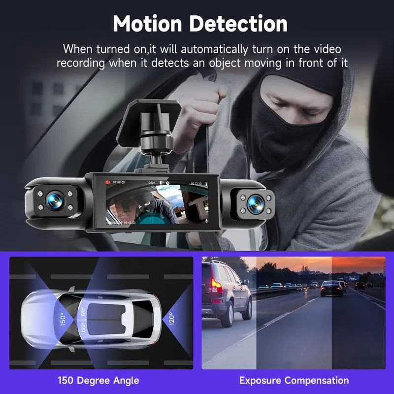 2) Four Cameras. Equipped with four cameras, the front three lenses can adjust the shooting angle, allowing you to capture more details as you like. It can easily cover 360 angles to ensure that there is no dead angle around the car. You can use one lens to capture the interior of the vehicle.
