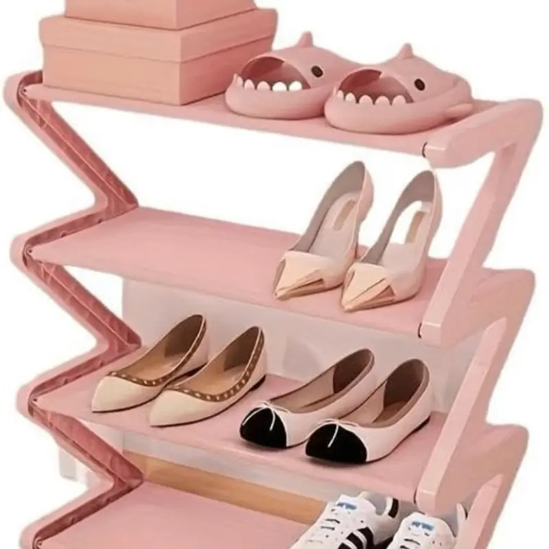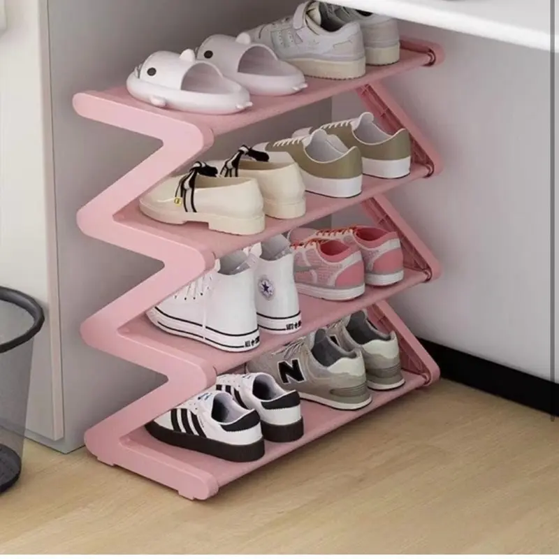 The 4 Layer Z Shaped Shoe Rack is an easy-to-assemble, stackable home organizer. Perfect for living rooms, dormitories, and schools, this pink plastic rack offers versatile storage solutions. Its Z-shaped design maximizes space efficiency. Ideal for organizing shoes and other small items, this organizer keeps your space tidy and clutter-free.