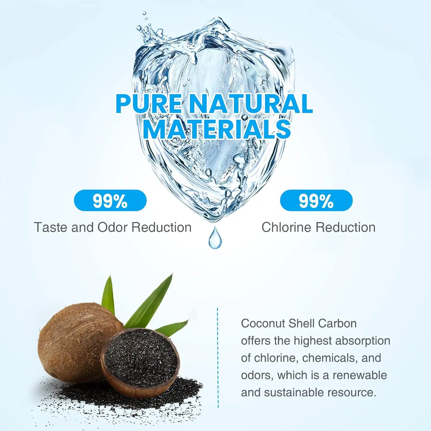 Made of 100% activated coconut shell, it filters up to 99% of sand, soil, particles, sediments, silt, rust, iron, sulfur, chlorine taste & odor. It provides crystal-clear, perfect water.