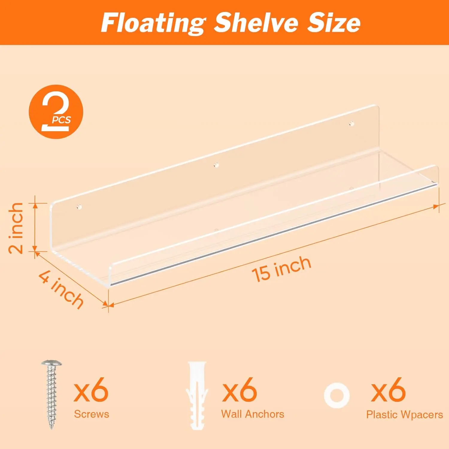 Elevate your space with our 4 Pack Acrylic Floating Shelves. This modern floating wall shelf set is perfect for any room. Each shelf measures 15 inches, offering ample space for books, decor, and more. Ideal for bathrooms, bedrooms, living rooms, kitchens, and classrooms. 🏠