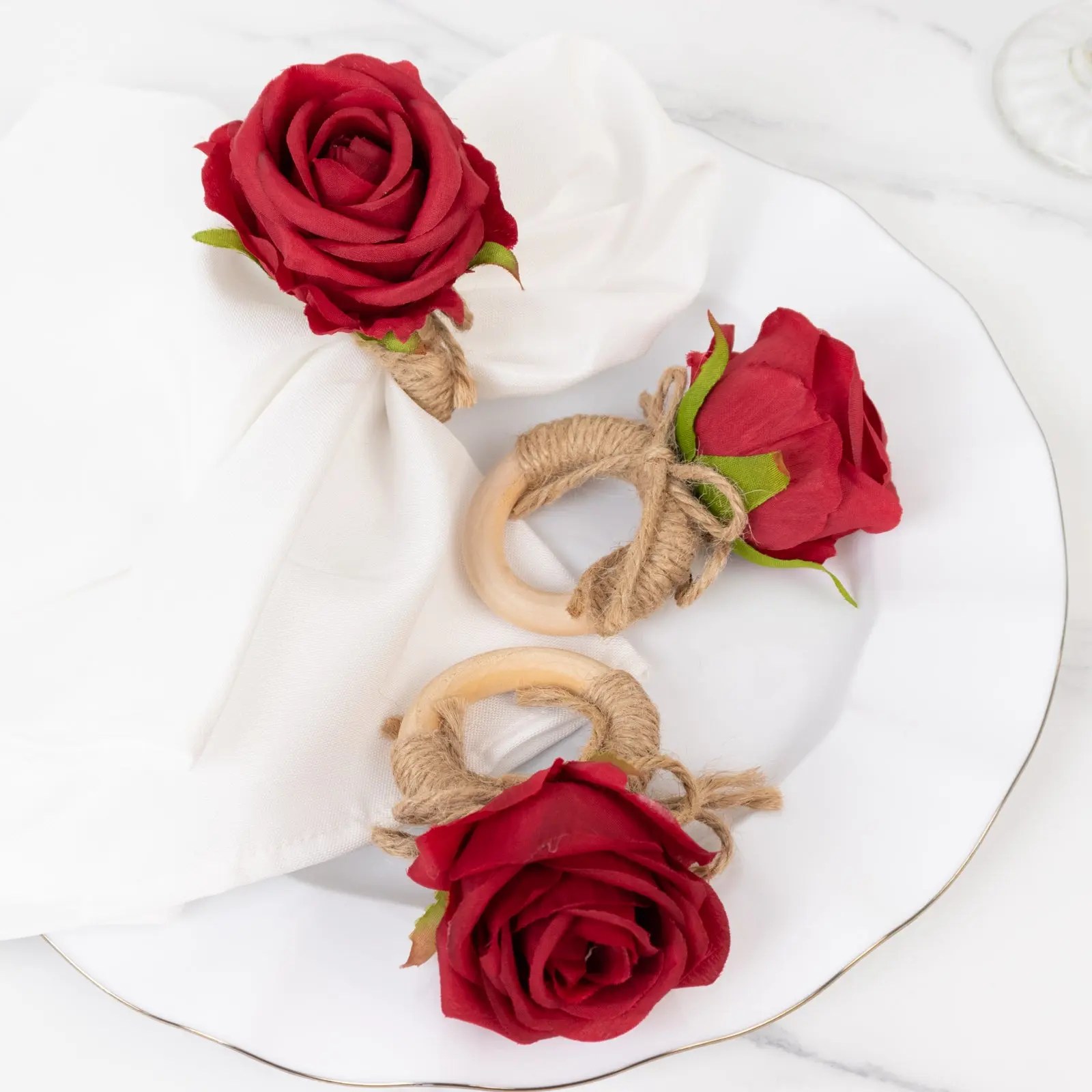 5. 4 Pack Red Artificial Rose Flower Wooden Napkin Holders, Farmhouse Country Floral Napkin Rings - 4"