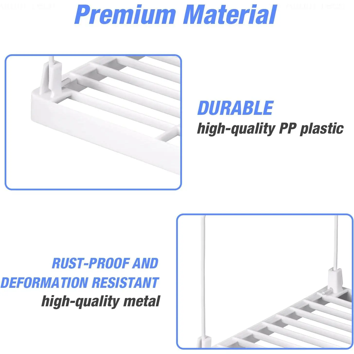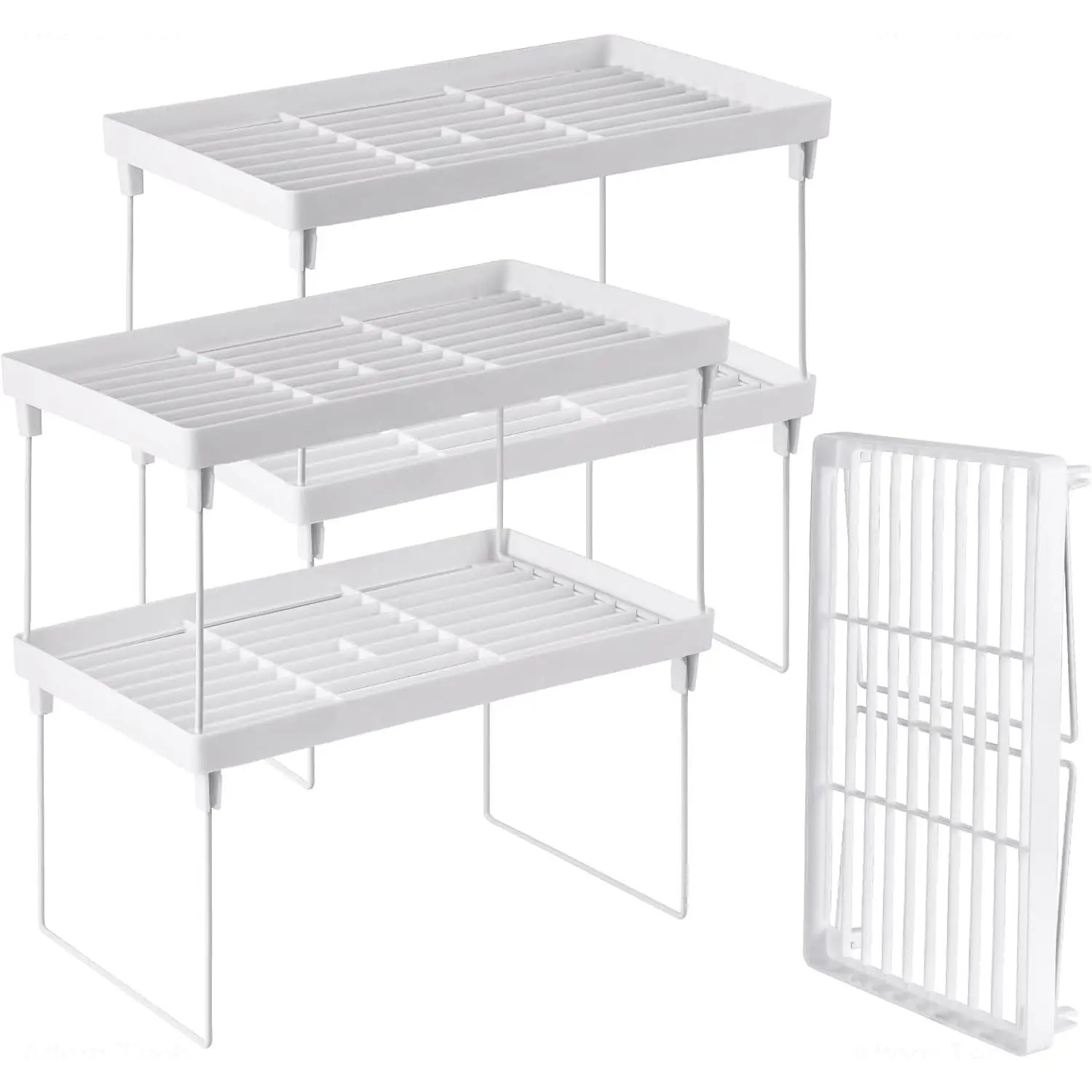 ✔️[Premium Material]Made of high-quality PP plastic and metal, this stackable kitchen cabinet organizer is durable, rust-proof and won't deform, ensuring long-lasting performance.✔️[Foldable Design]The foldable legs can be easily extended and retracted without tools.When not in use, it is very convenient to put away the organizer at any time to save space.It is simple, lightweight, compact in size, easy to place, practical and convenient to use.After removing the brackets, the plastic top can be used as a draining rack for dishes, cutlery and utensils.✔️[Stackable Shelves]The racks can be placed side by side or in an L shape for extended storage or stacked with two layers of storage.Note: it is recommended to stack no more than 2 layers.They can be used according to the actual space and your needs.✔️[4PCS Value Pack]This set contains four shelves with a stackable and expandable design that is easy to assemble and can double or even triple your storage space to accommodate more items for various needs.✔️[Multifunctional Racks]Perfect for kitchen cabinets, pantry, desks, dressers, craft closets, bathroom cabinets, under sinks or anywhere you need to add more space.