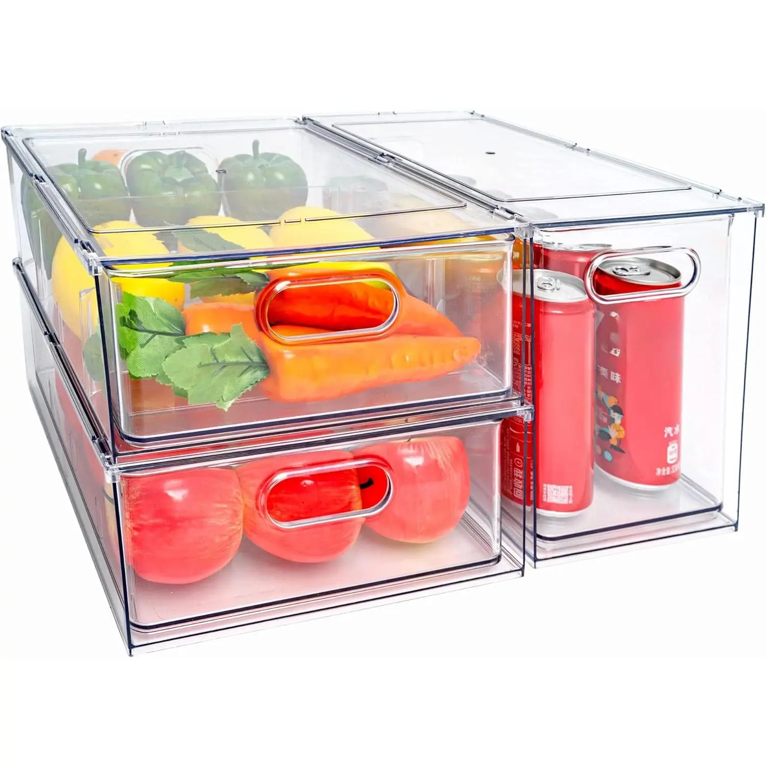 4 pack Stackable Refrigerator Organizer Bins Pull-Out Drawers for Fruit and Veggies Storage Organizer for Fridge Clear Drawer Containers with Handle Divided Organization for Produce Saver