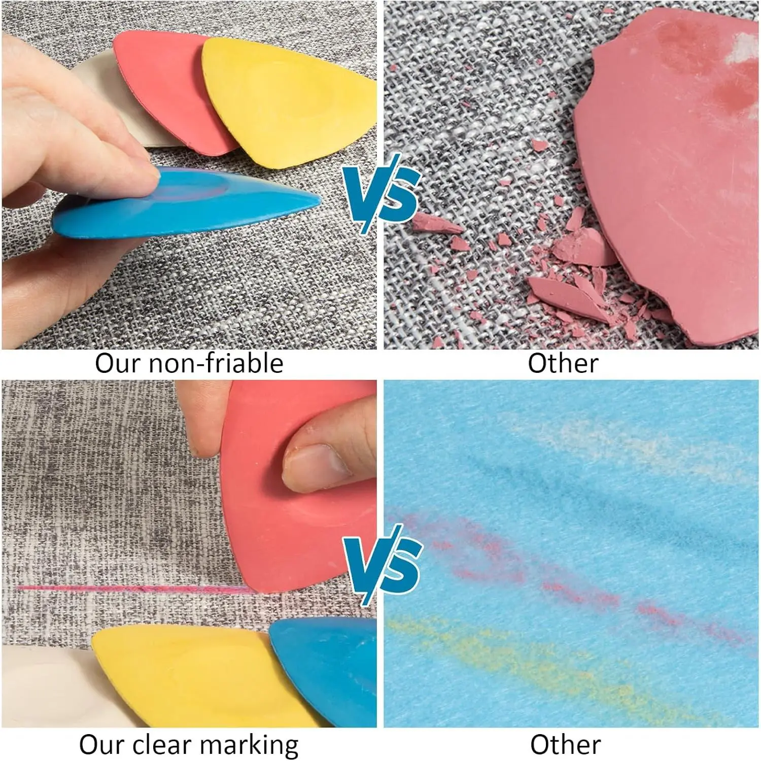 【4PCS Triangle Tailor’s Chalk Set】This set includes four triangular tailor’s chalk pieces in white, blue, yellow and red. As essential fabric-marking tools, these chalks are designed for marking in DIY tailoring, quilting and crafts, suitable for both beginners and professionals.