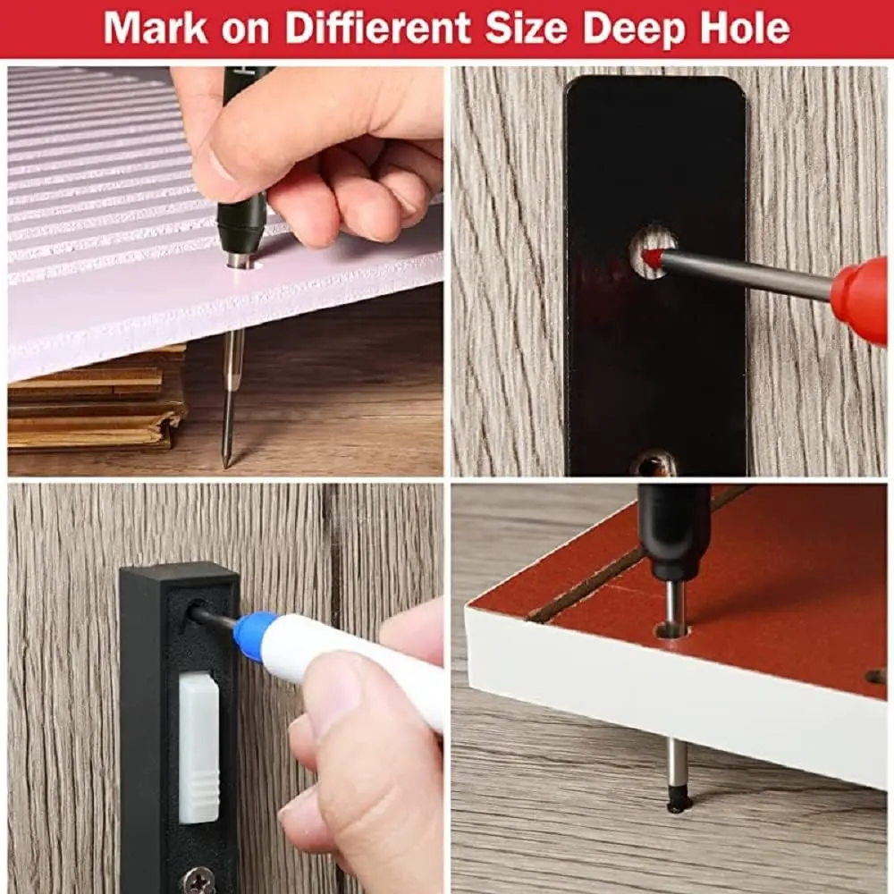 Versatile Applications: This long tip deep hole marker can be used on a variety of surfaces, such as wood, metal, glass, and plastic. This multi-purpose deep hole marker is suitable for home décor, marking and drilling locations, furniture embellishment, hardware processing, automotive manufacturing, industrial processing, and other fields.