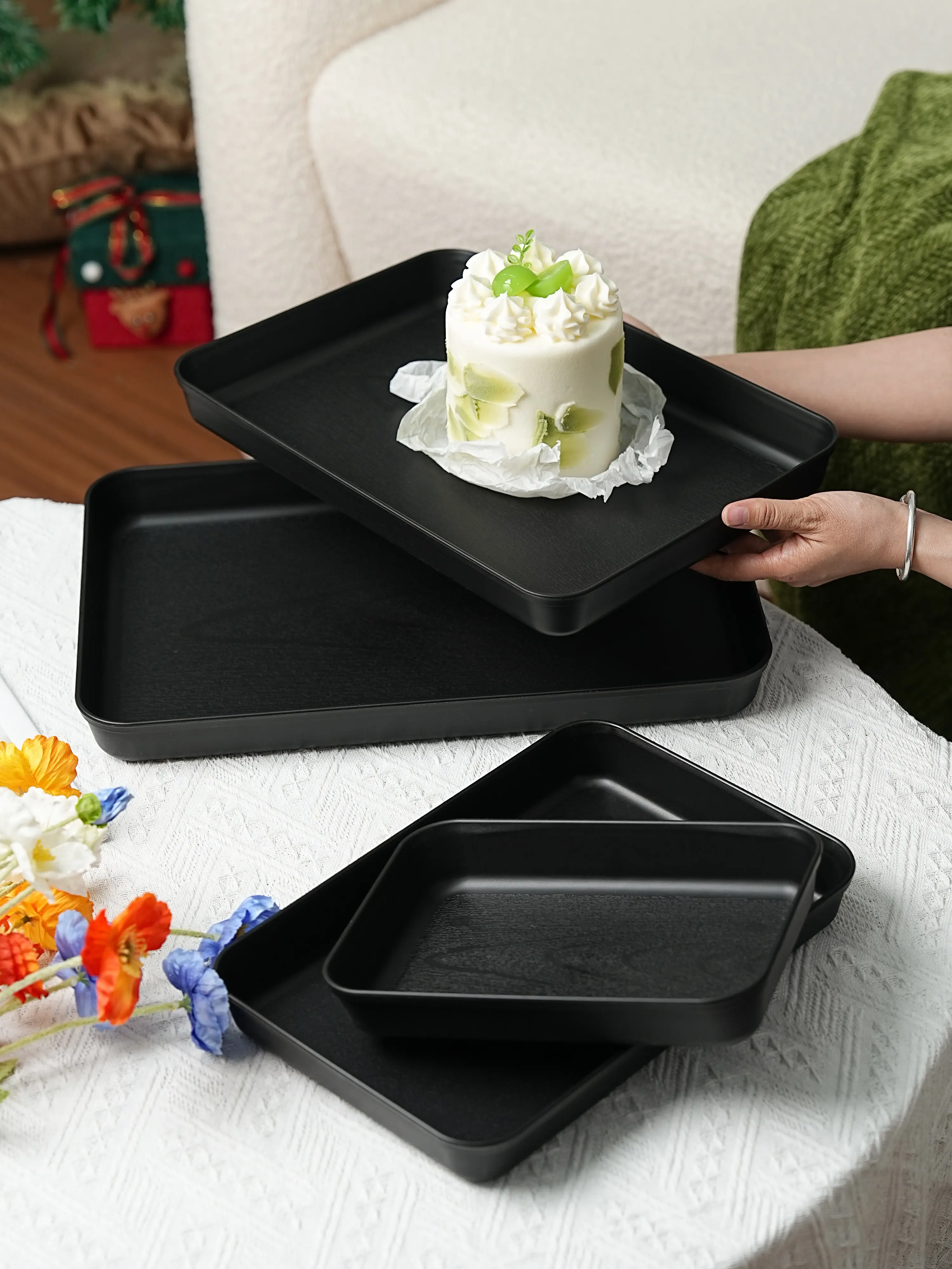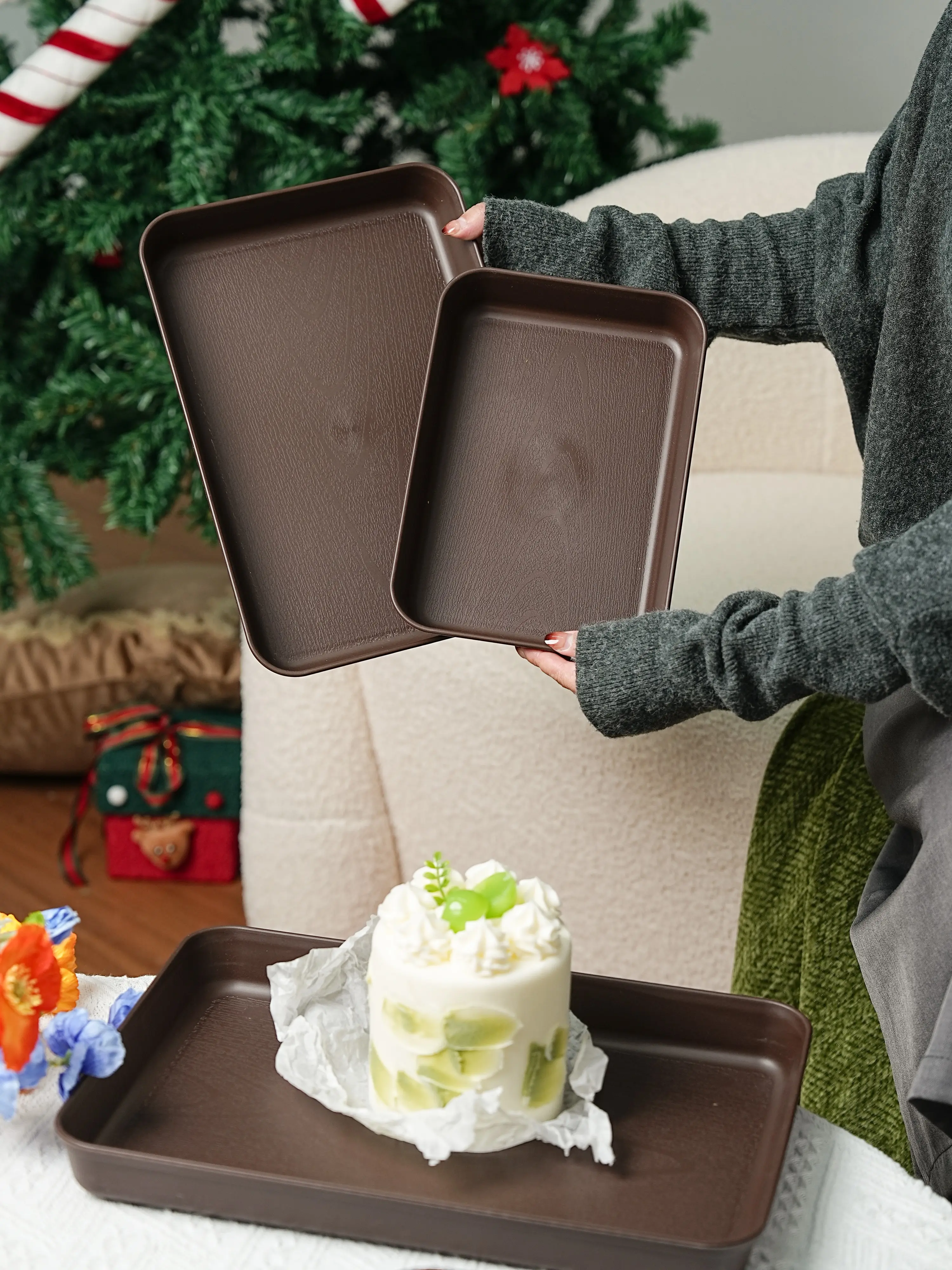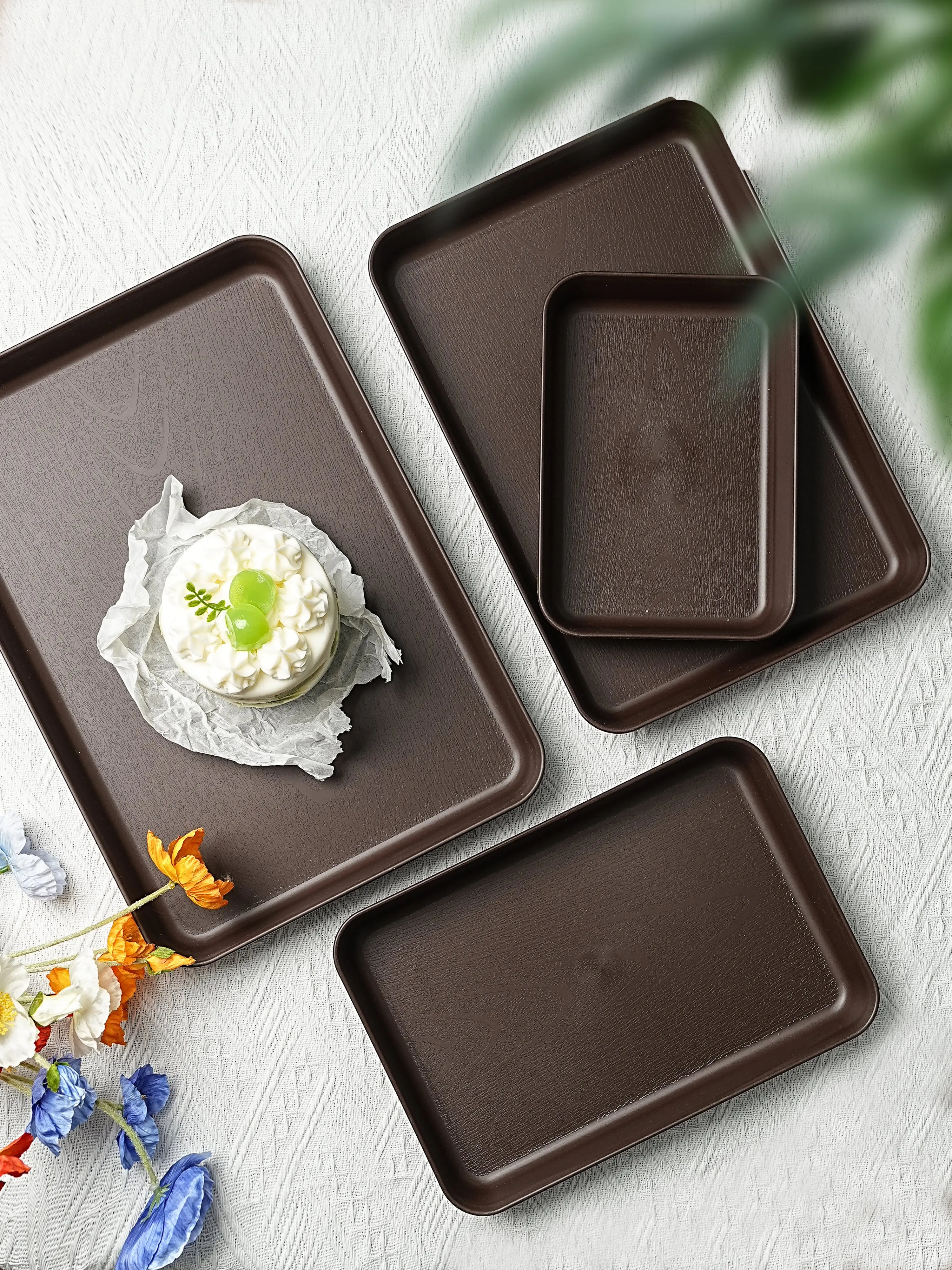 Reusable PP Plastic Serving Trays Ideal for cookies, appetizers, deli foods, snacks, desserts and fruits. Perfect for party food presentation; stackable design for kitchen countertop use. Available in multiple sizes and colors.