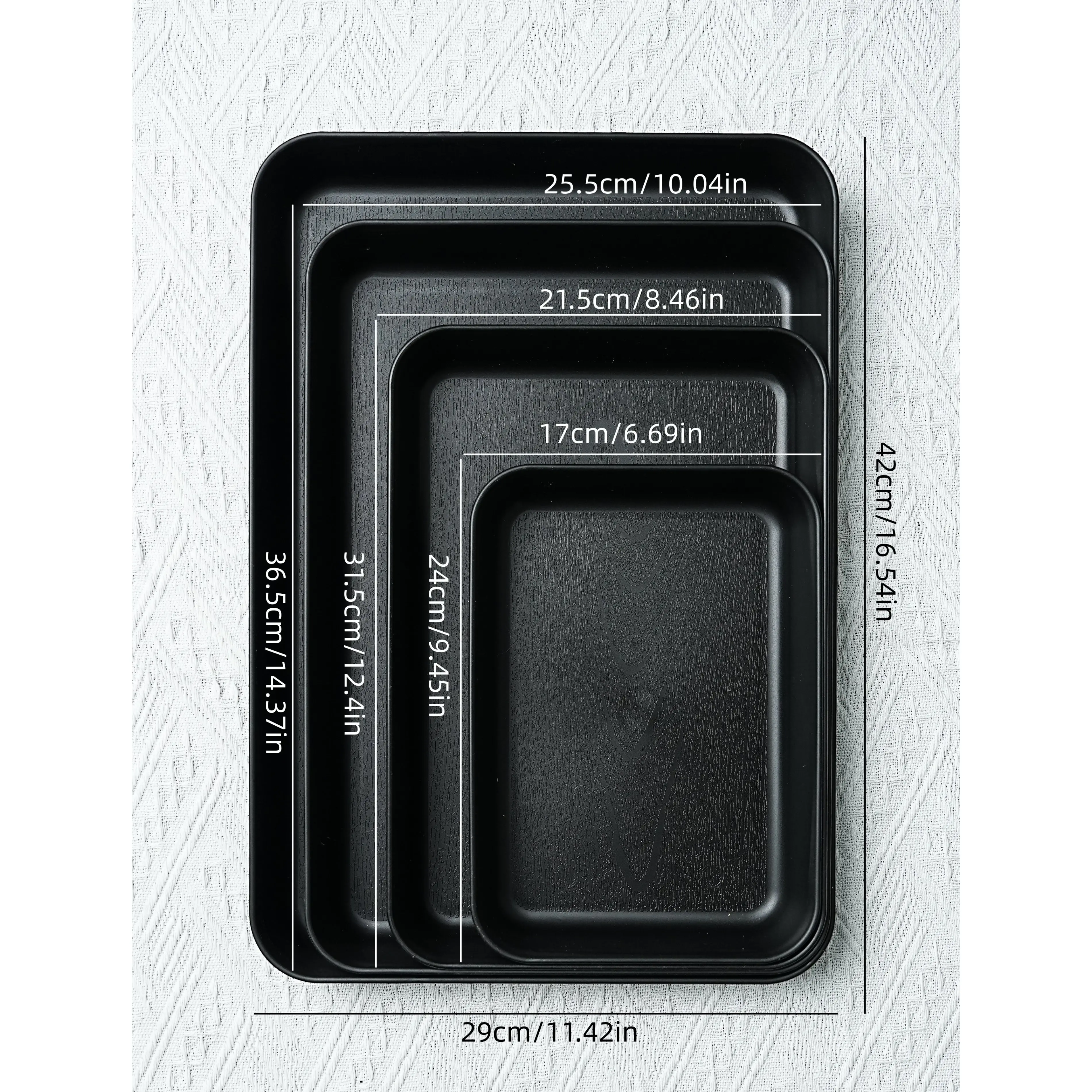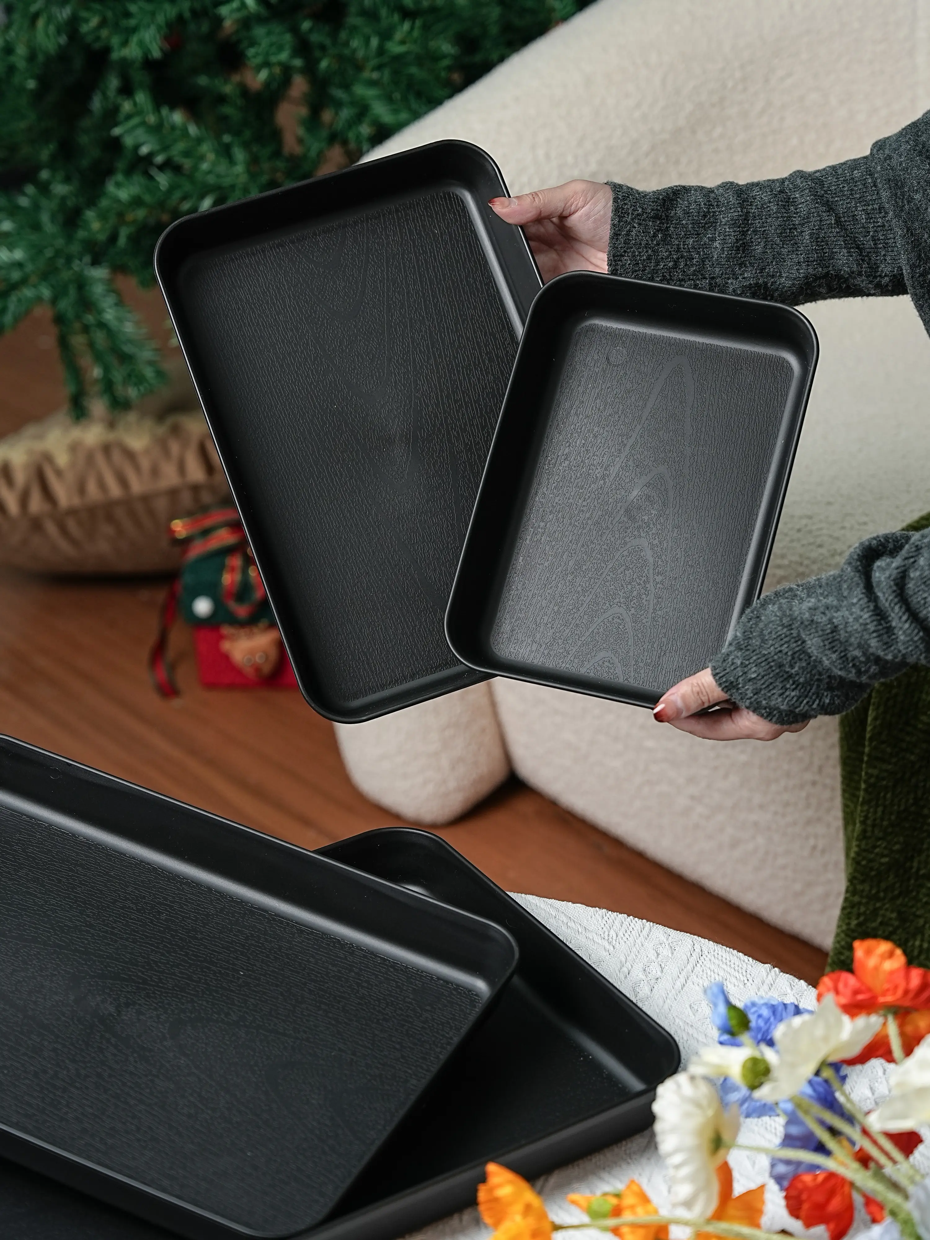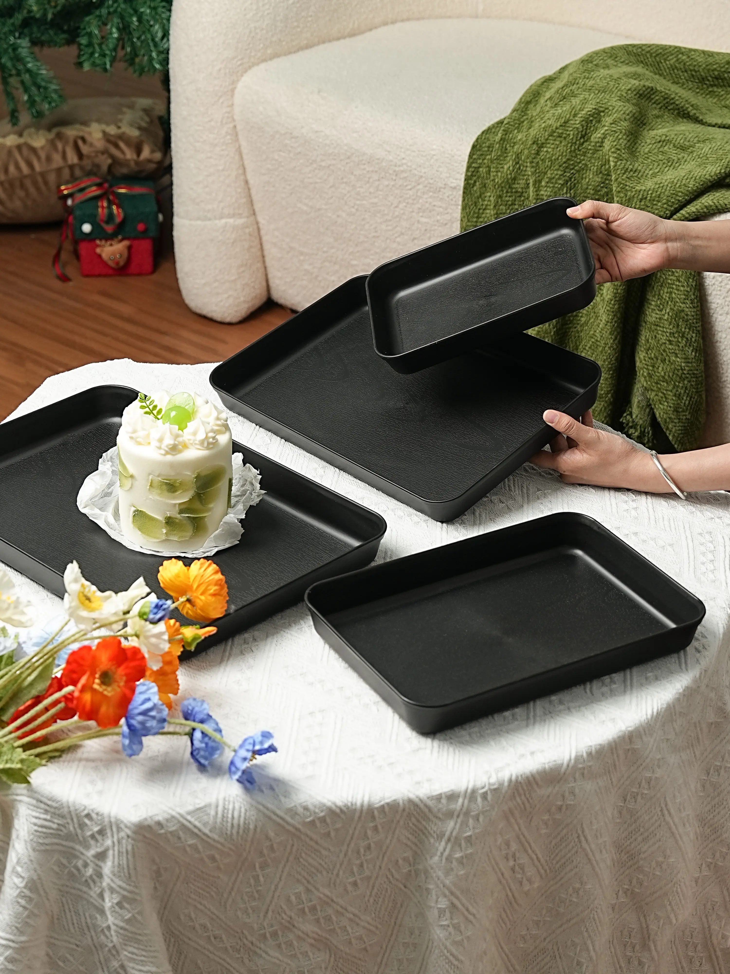 Reusable PP Plastic Serving Trays Ideal for cookies, appetizers, deli foods, snacks, desserts and fruits. Perfect for party food presentation; stackable design for kitchen countertop use. Available in multiple sizes and colors.
