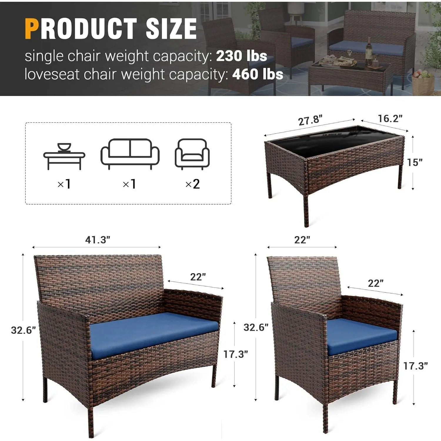 ·Comfortable&Humanized design: Our porch furniture prioritizes your comfort compared to other similar small patio furniture.The chair is relatively tall and more friendly to tall people. The armrest width is really wide, so there is no need to worry about discomfort when leaning against the hand. Each sofa seat is equipped with soft sponge cushions, bringing you ultimate comfort. The seat cushion is detachable, easy to clean and maintain.
