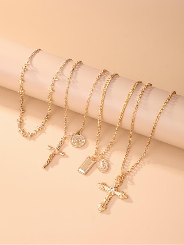 4-Piece Vintage Metal Geometric Circle Pendant Layered Necklace Set, Women's Punk Style Jesus Cross Pendant Jewelry, Unique Fashion Accessories