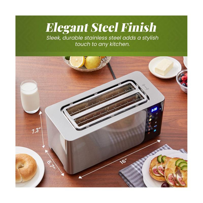 Toast your way through breakfast with this Elite Cuisine 4-slice toaster, featuring a sleek digital image screen. With six adjustable shades and functions like defrost and reheat, you can enjoy perfectly toasted bagels, waffles, and more. Make mornings easier with the self-centering guides and the auto pop-up and shut-off features. From Elite Cuisine.