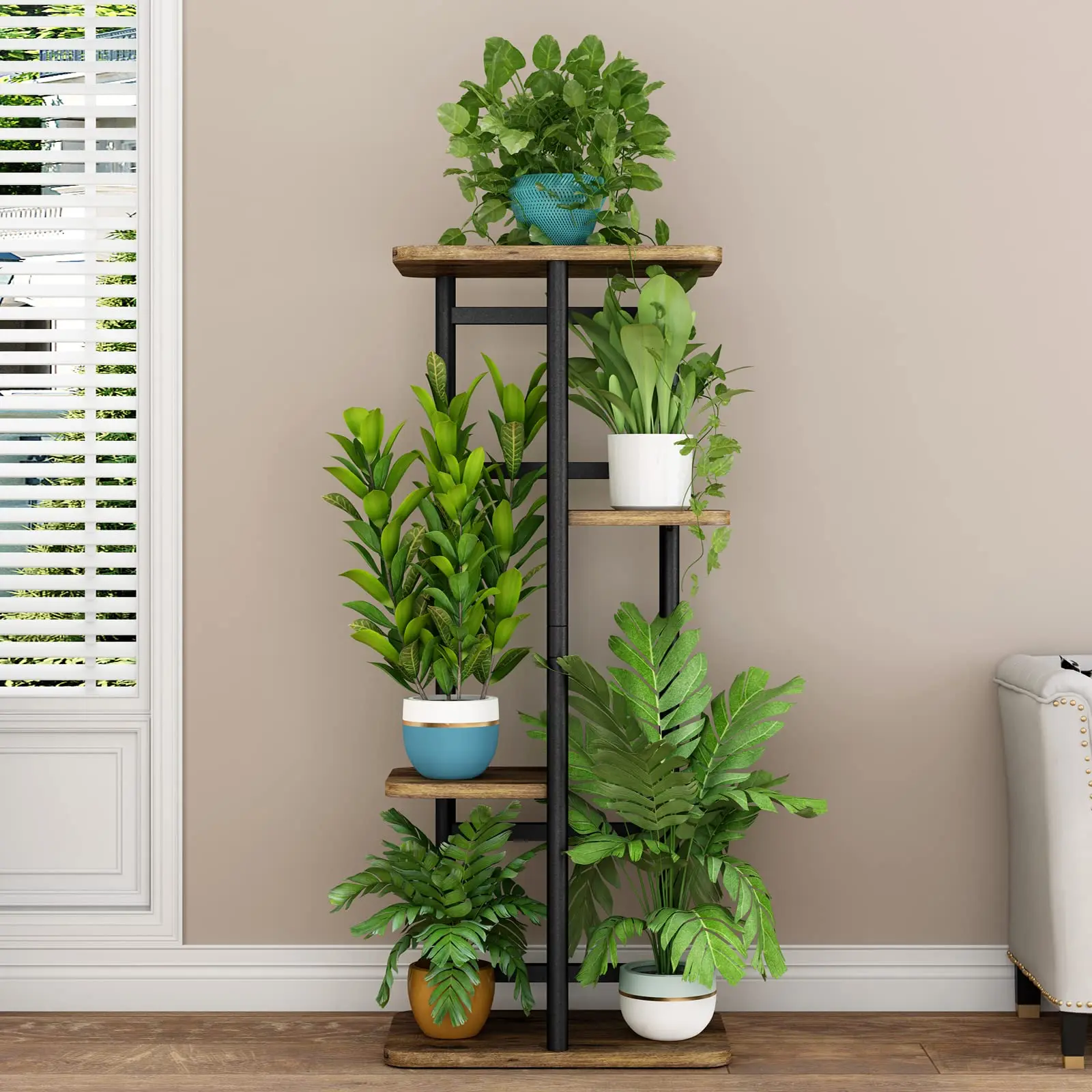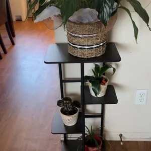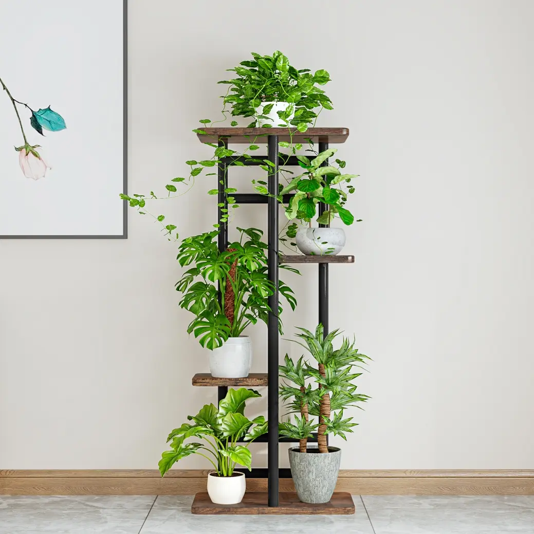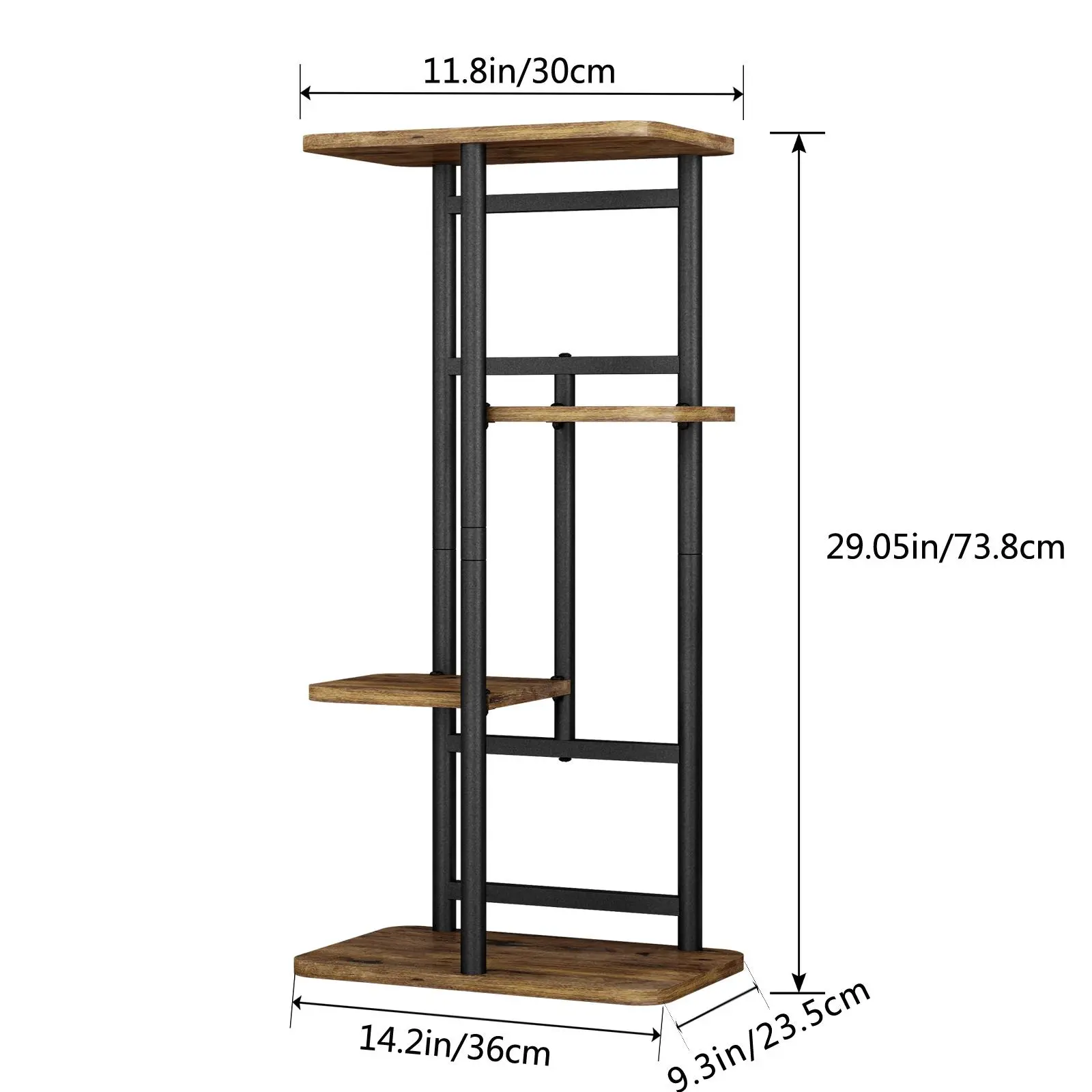 The plant stand is made of 100% pure iron and MDF, smooth and burr-free, easy to maintain and wipe. The plant stand has 4 tiers of space and can hold up to 5 potted plants. The assembly size is: 14.17L*9.05W*29.05H in (36*23*73.8cm).