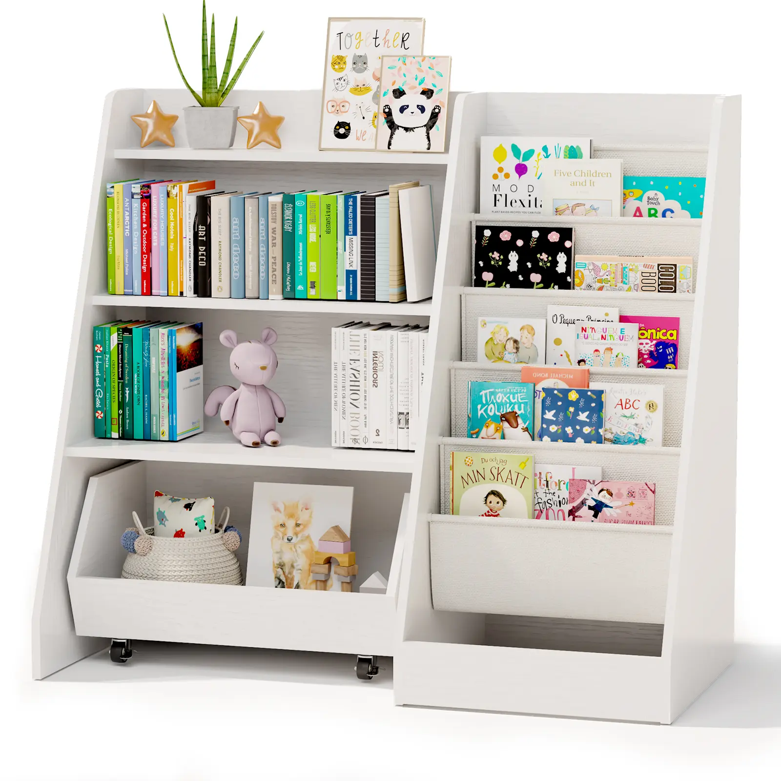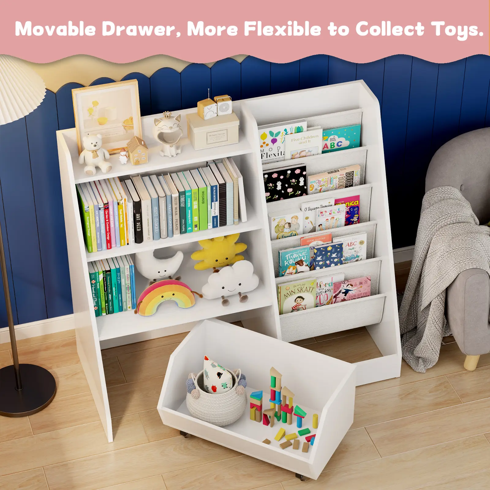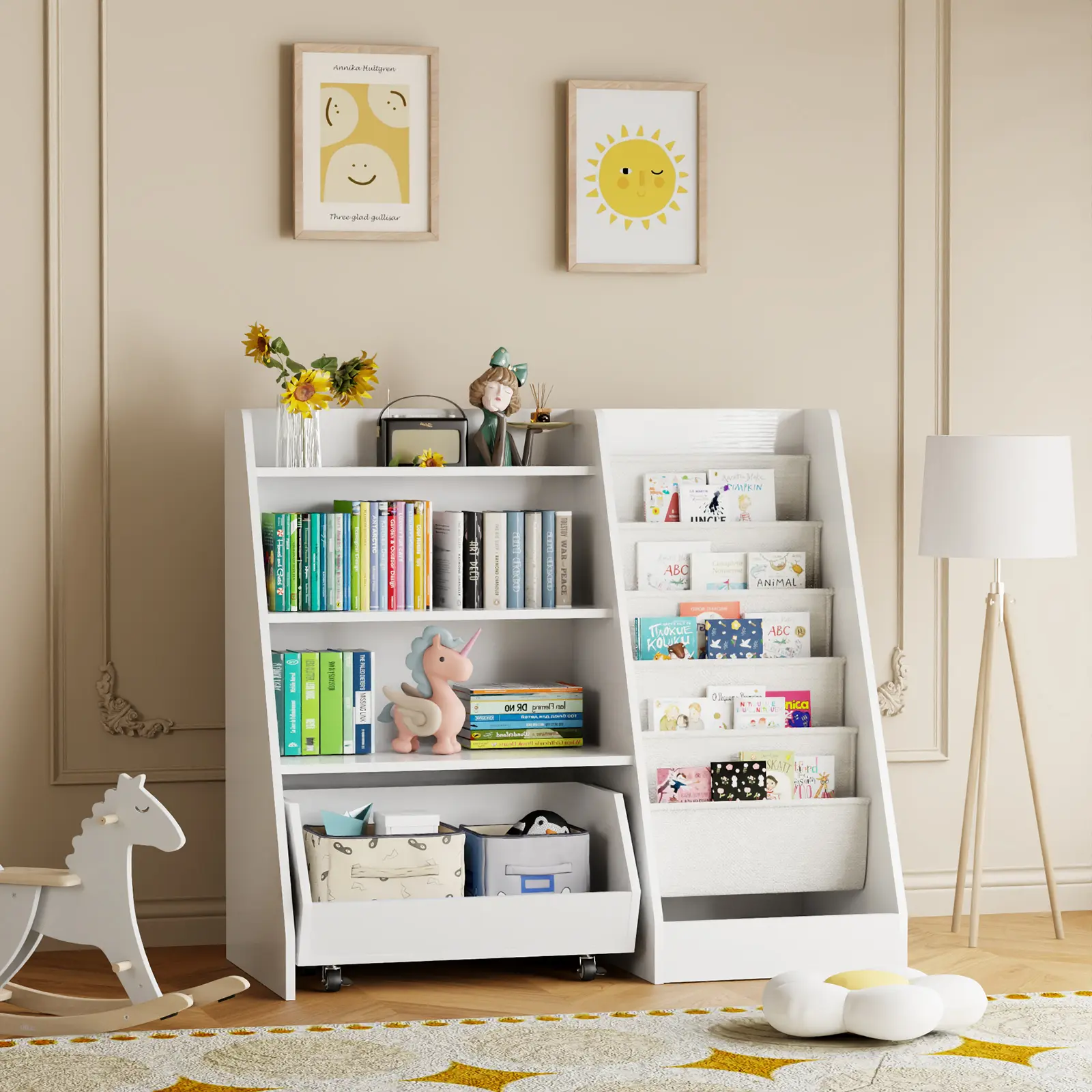【Practical Storage】Our bookshelf for kids features 3-tier display shelves for books, toys, and ornaments; five sling pockets for easy storage of kids books. While one drawer with rolling wheels can be easily moved to different areas .