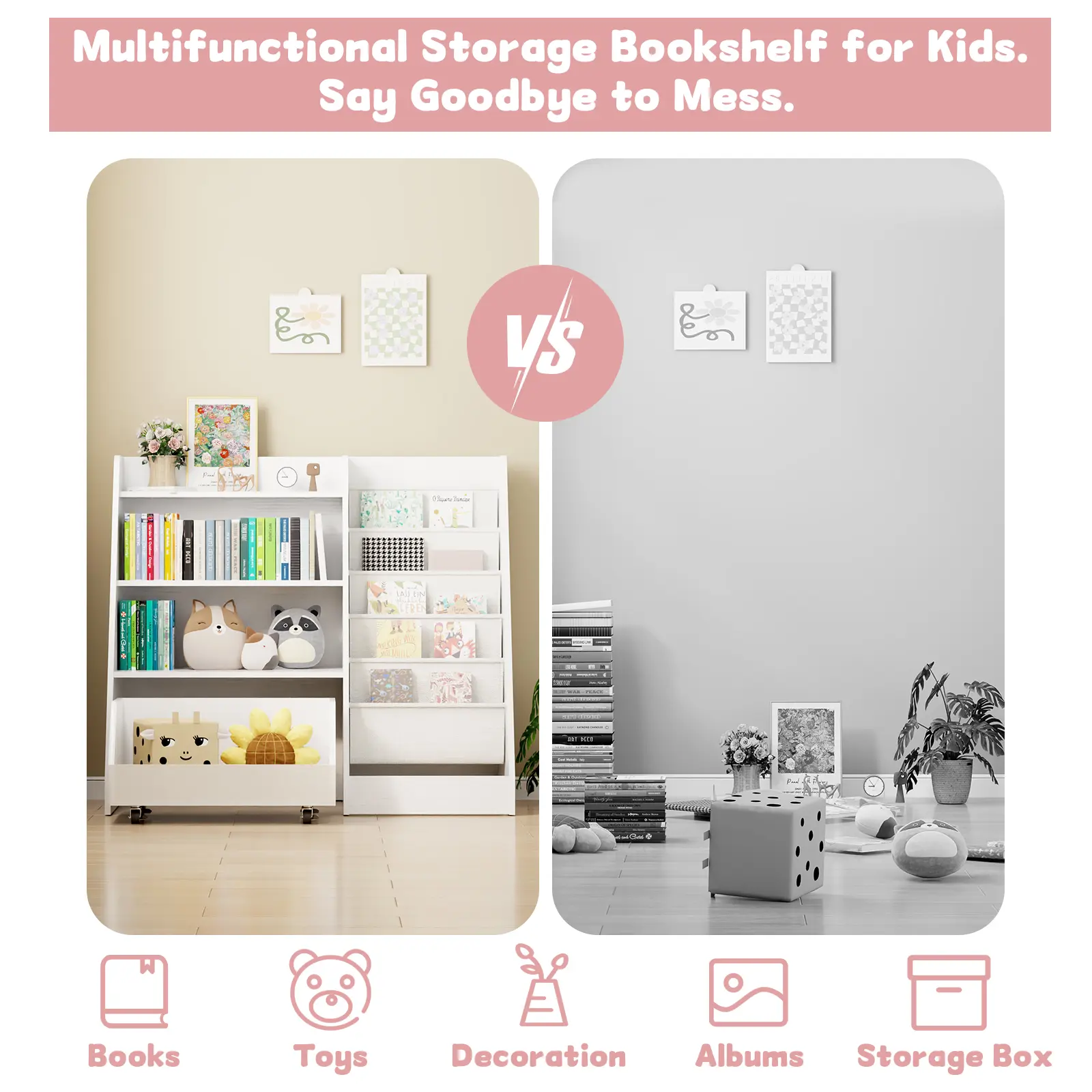 4-Tier Rolling Toy Storage Cabinet for Kids, 5 Layer Sling Toddler kids furniture,Baby Furniture Book Rack,Book and Toy Organizer Cabinet with Wheels , White.