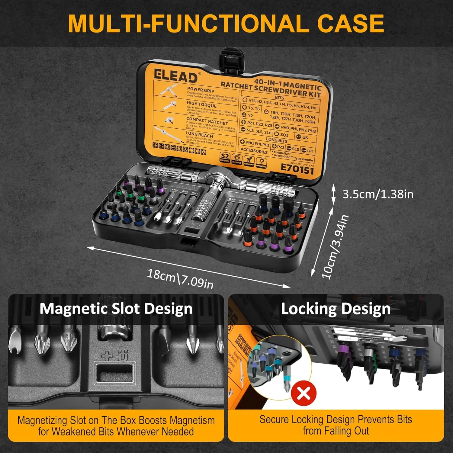 ·MAGNETIC SECURITY - Strong magnetic handle and bit holder keep bits secure during use, while color-coded rings enable fast bit identification, boosting work efficiency and organization, making this ratchet screwdriver set essential for any toolkit.