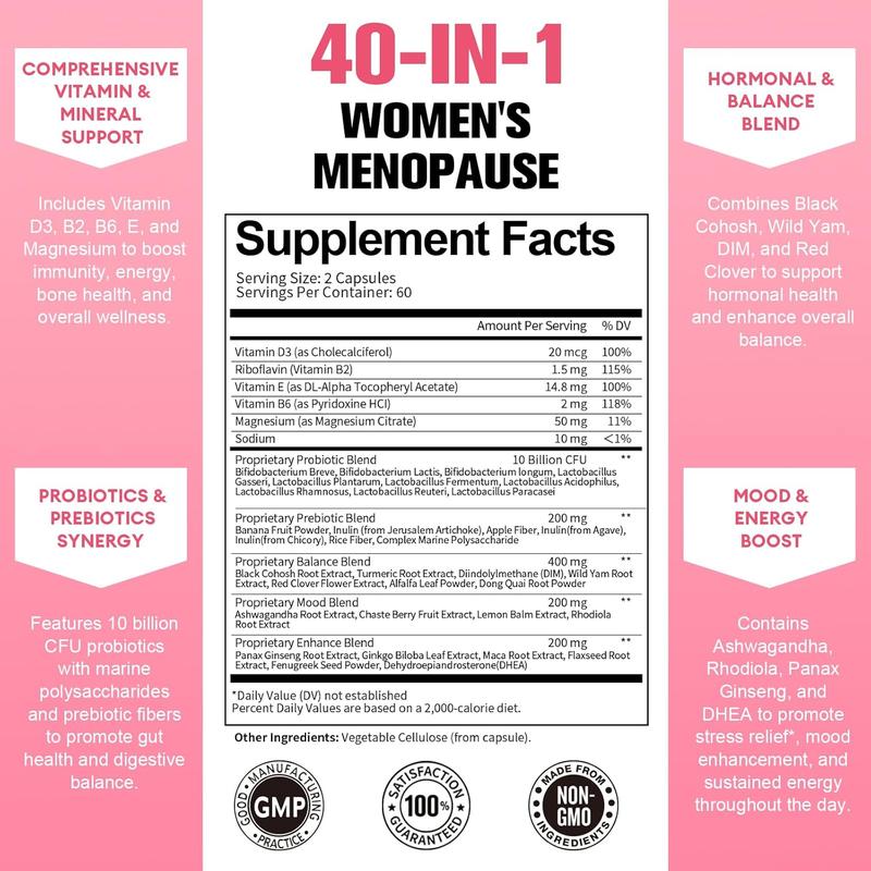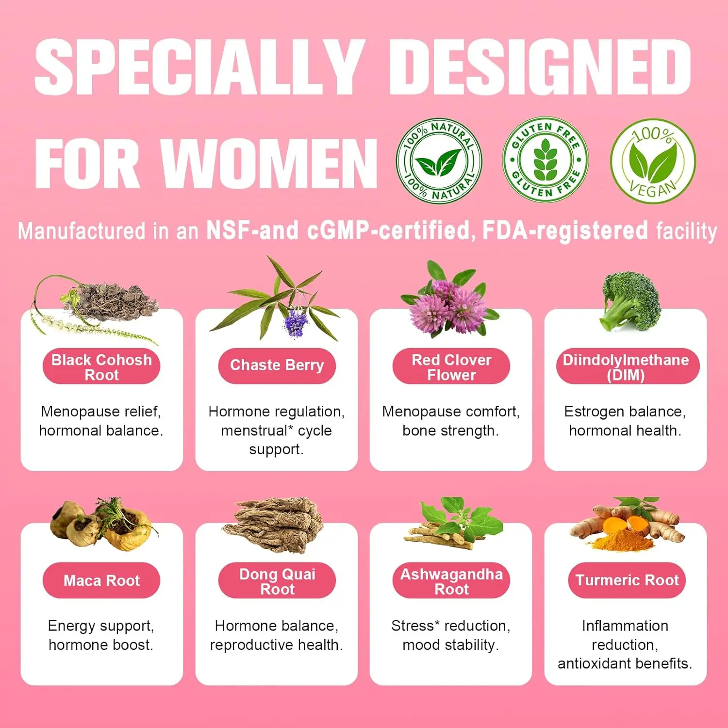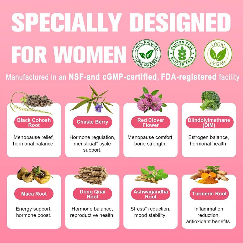 ·Menopause Relief and Hormonal Balance: Our comprehensive hormone supplement is specifically designed for women menopause. It features a blend of Vitex Berry, DIM, Dong Quai, Red Clover, Wild Yam, Chasteberry, and Black Cohosh to balance hormones and relief hot flashes.