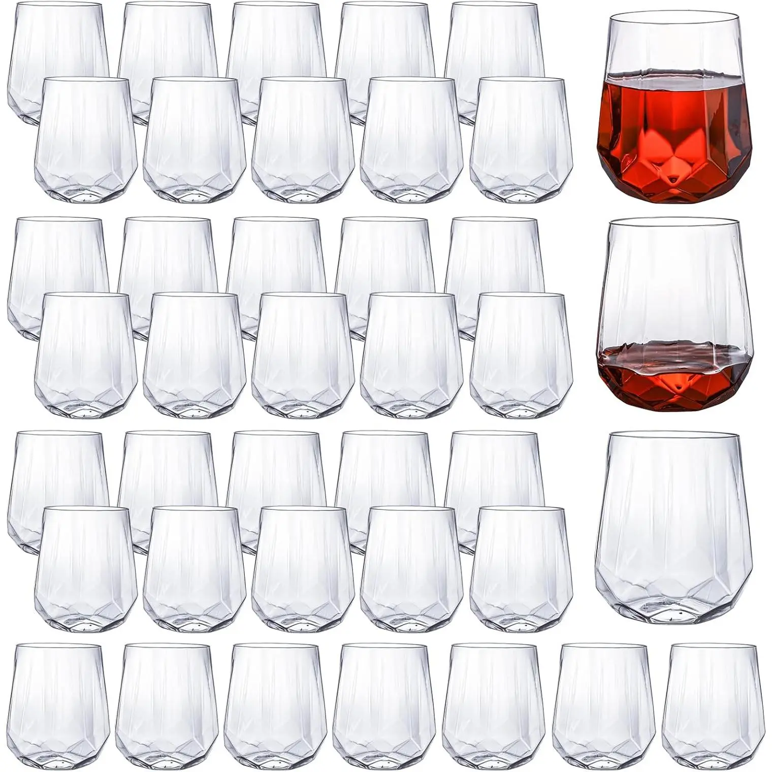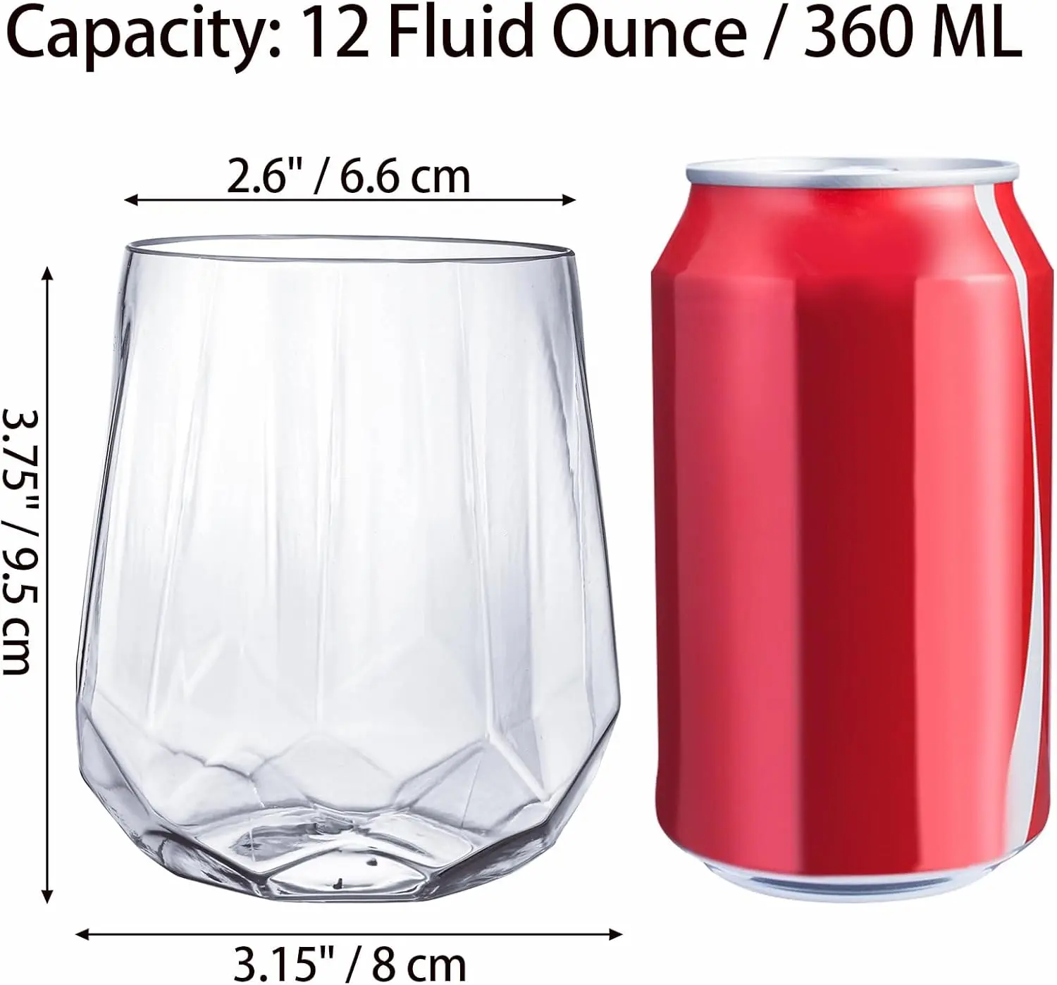Bulk Pack: Package includes 40 plastic stemless glasses, clear and unbreakable. Each measures 2.6" / 6.6 cm top dia. x 3.75" / 9.5 cm H, widest dia. is about 3.15" / 8 cm; Capacity: Max. 12 Fluid Ounce / 360 ML. Ideal for large gatherings and special occasions