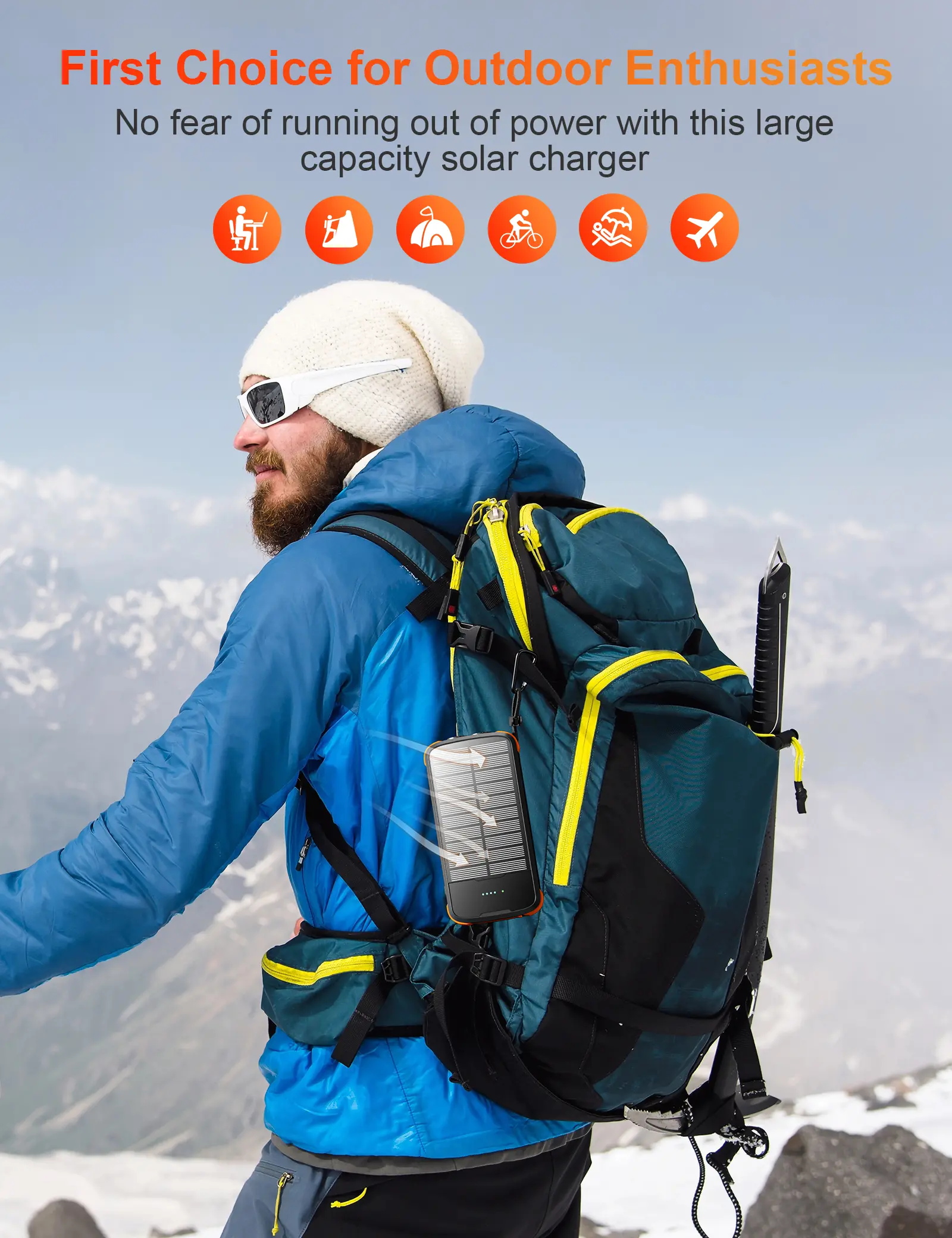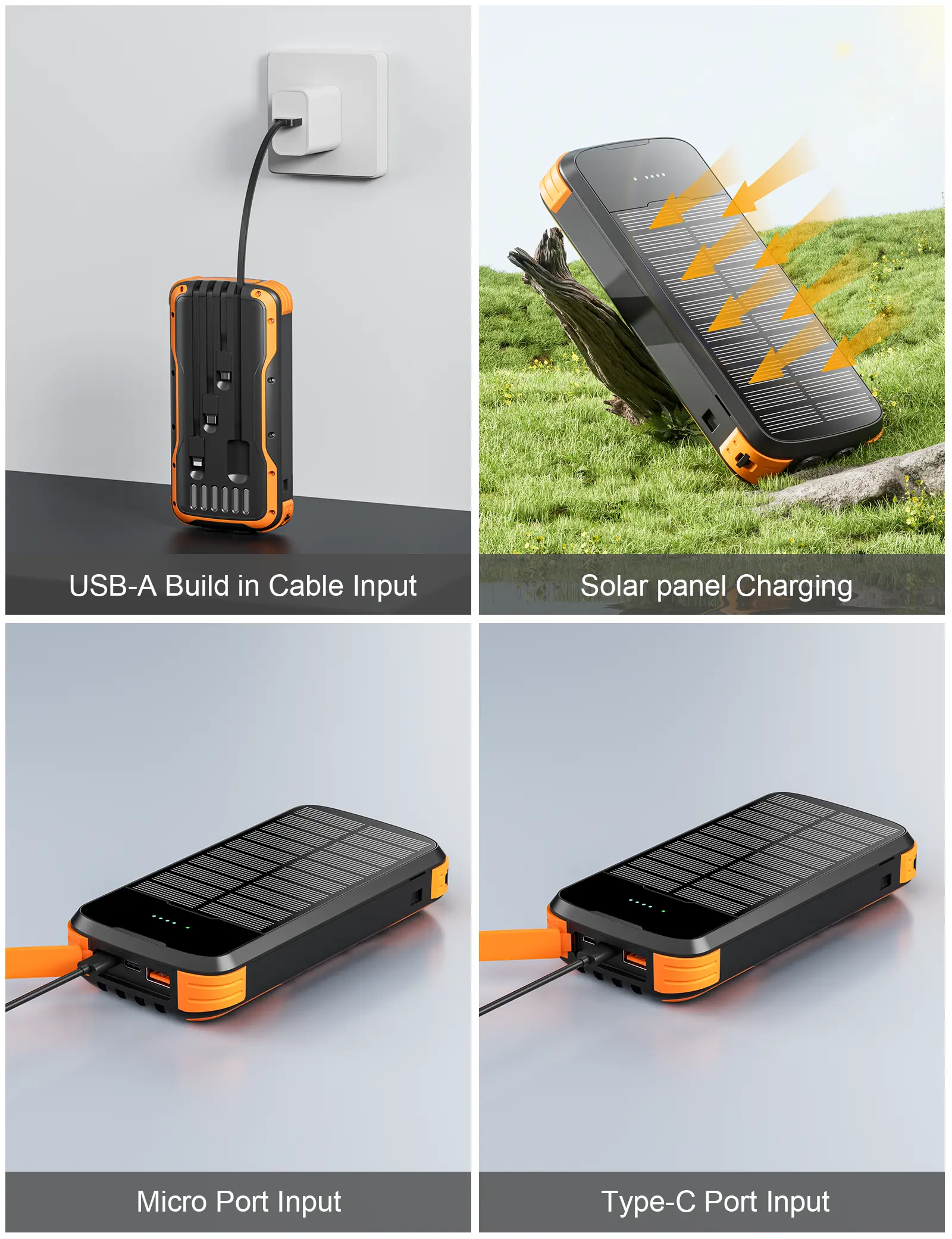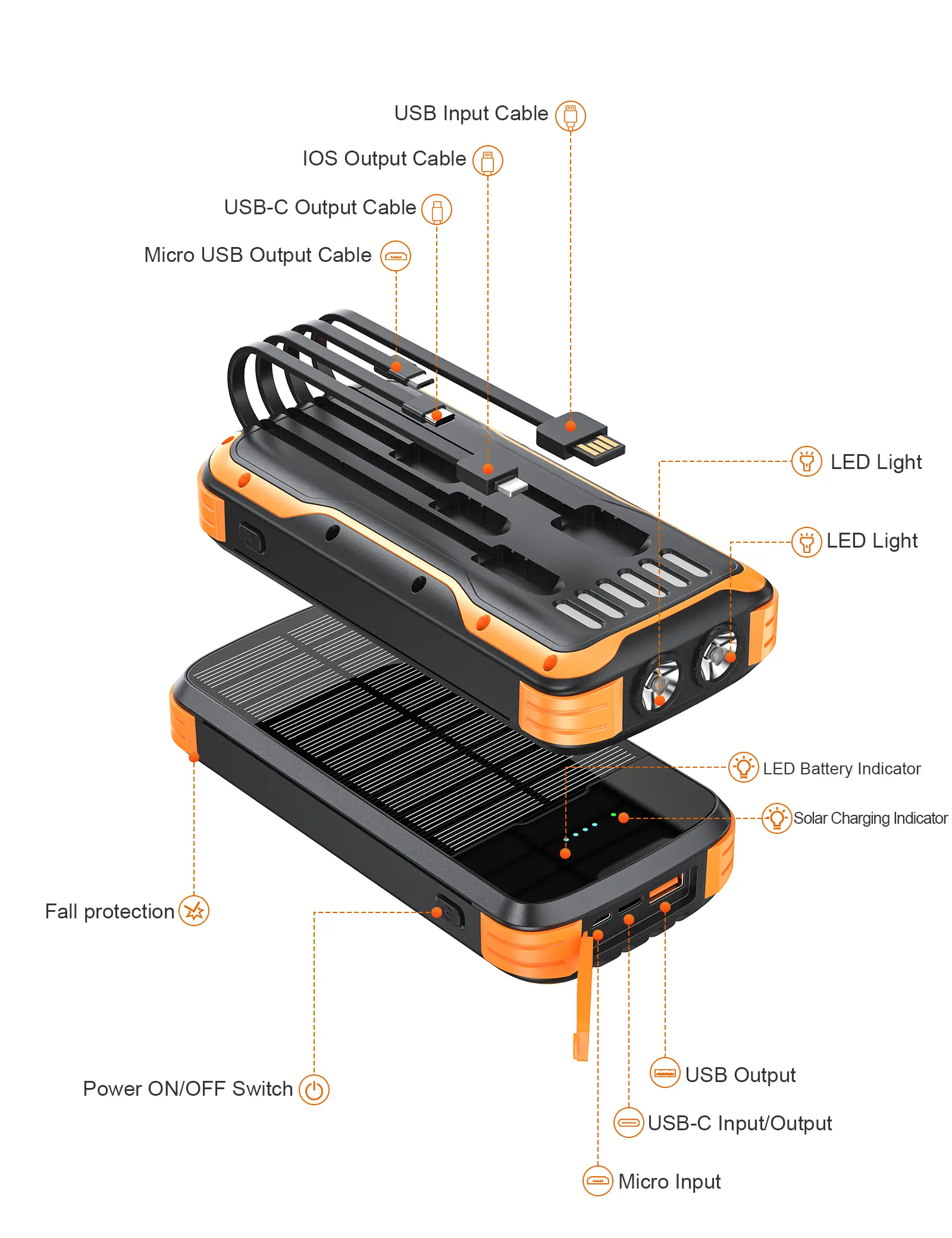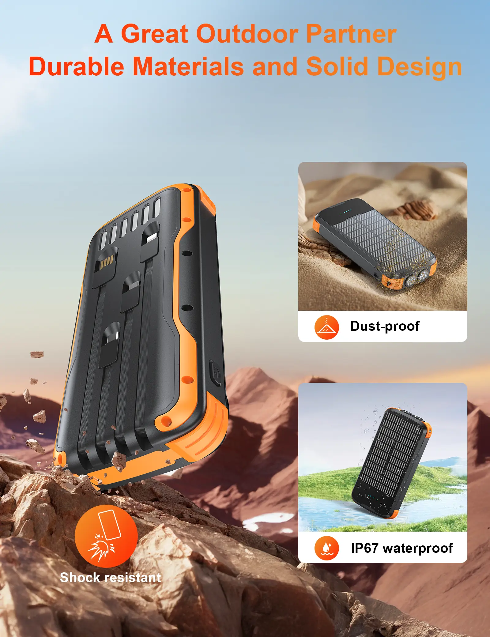 Ever been caught on a camping trip or hike with your phone dying and no outlet in sight? This 40,000mAh solar power bank is your new best friend. It packs massive power to keep your phone, tablet, or even your Apple Watch charged all day long. The built-in 4-wire flashlight shines bright at 300 lumens, with multiple modes including SOS, so you’re never left in the dark. Plus, it’s ruggedly designed with IP67 waterproof, shockproof, and dustproof ratings—perfect for outdoor adventures. Recharge it multiple ways: plug it in via USB Type-C or Micro USB, or simply let the solar panel soak up the sun. With 5 output ports and 4 built-in cables, you can power up multiple devices fast, thanks to its PD20W max fast charging tech. Compatible with a wide range of devices like iPhone 15, Samsung S24, Google Pixel 8, and tablets, it’s the ultimate travel companion. Whether you’re camping, hiking, or just exploring the outdoors, this power bank keeps you connected and prepared. Ready to power up your next adventure? Grab this versatile solar power bank and never worry about running out of juice again!
