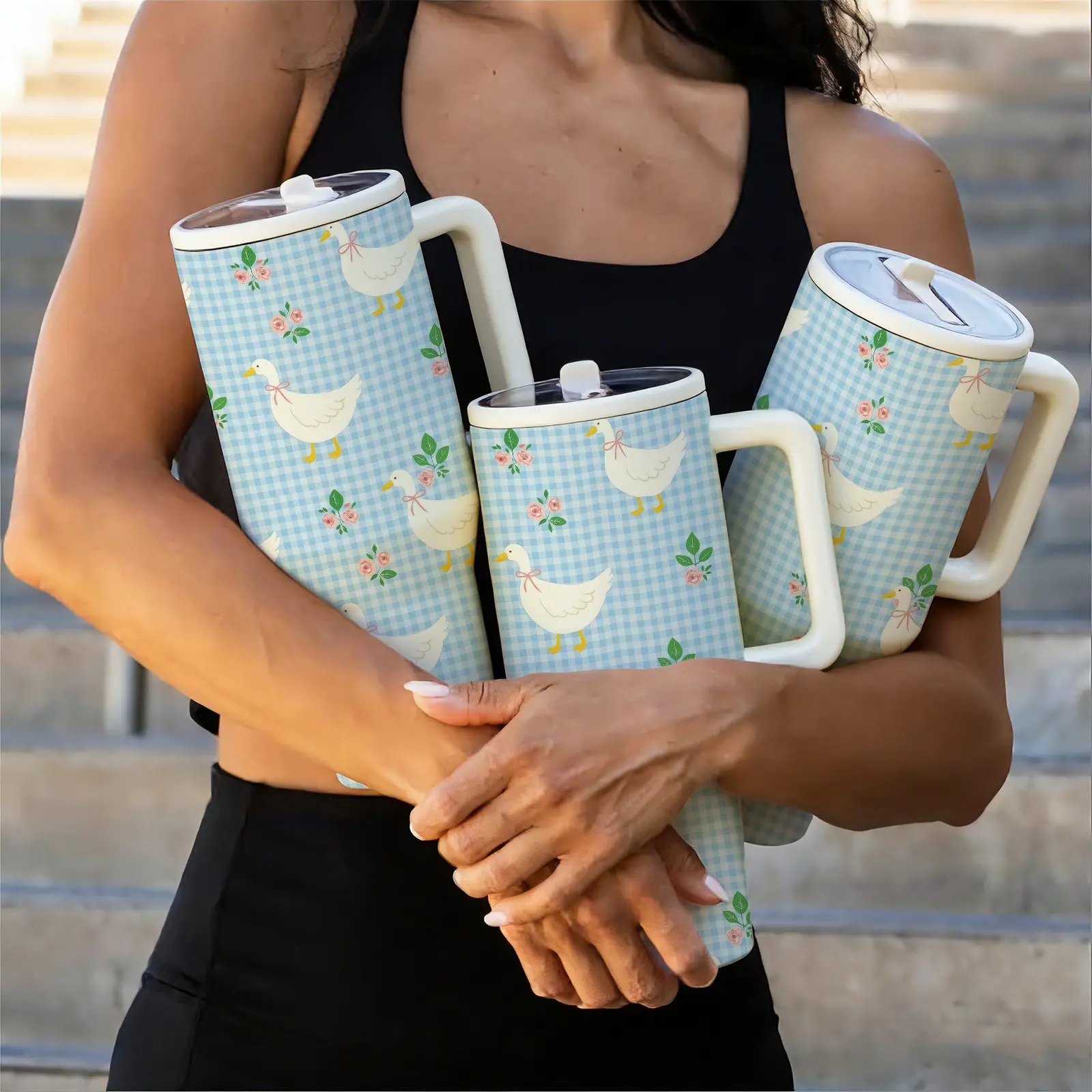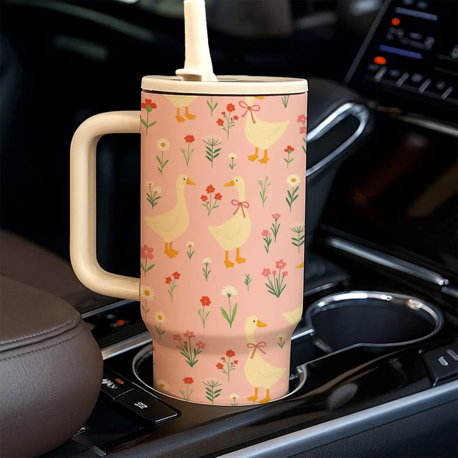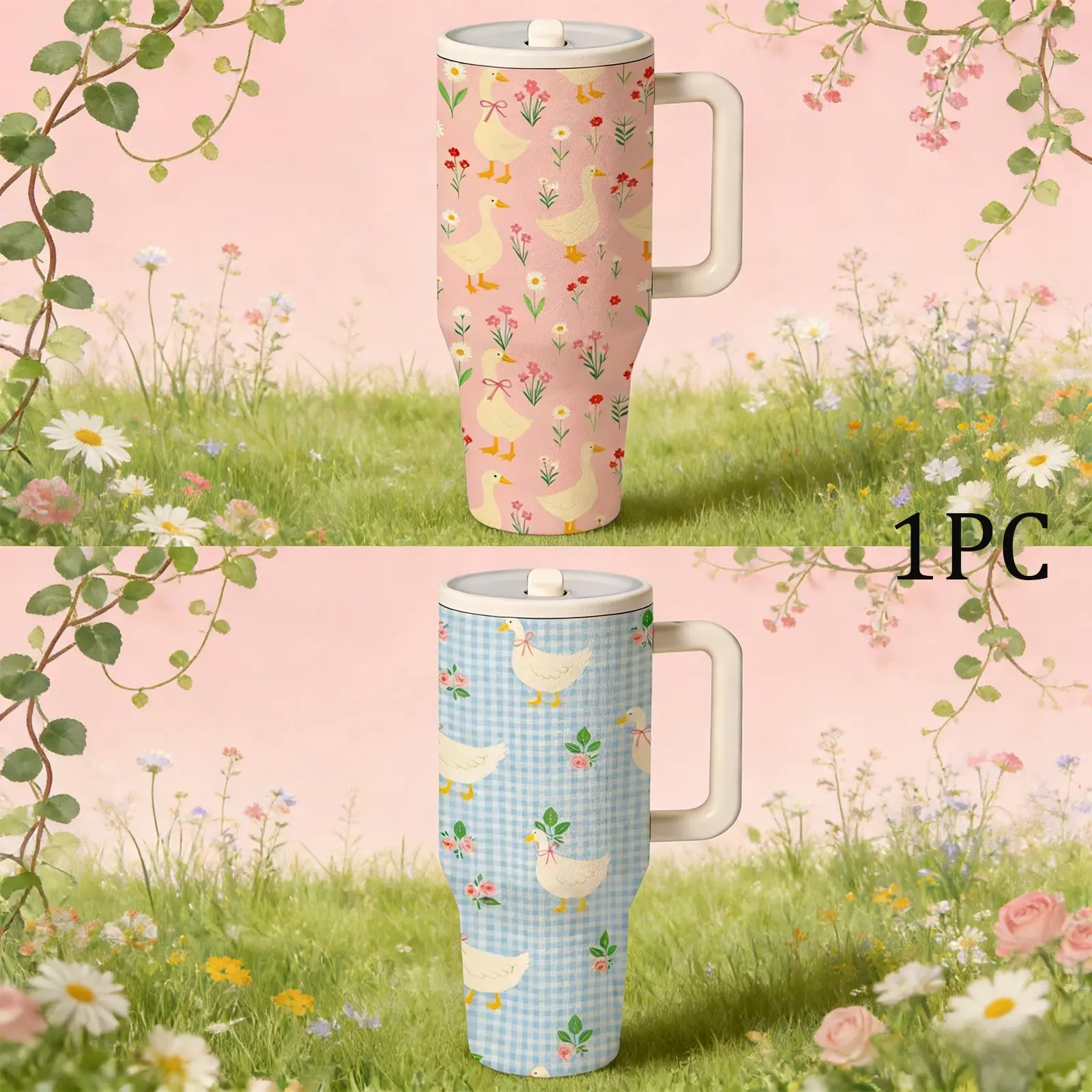 1 Pc 40oz Insulated Mug With Handle & Lid, Double Wall Vacuum Cup, Leak Proof Large Capacity Thermal Mug, Keeps Hot 12 Hours Cold 24 Hours, Floral Goose Spring Pattern, Cute Gift For Women Men, Valentine Holiday Car Drinkware, Leakproof Insulated Tumbler