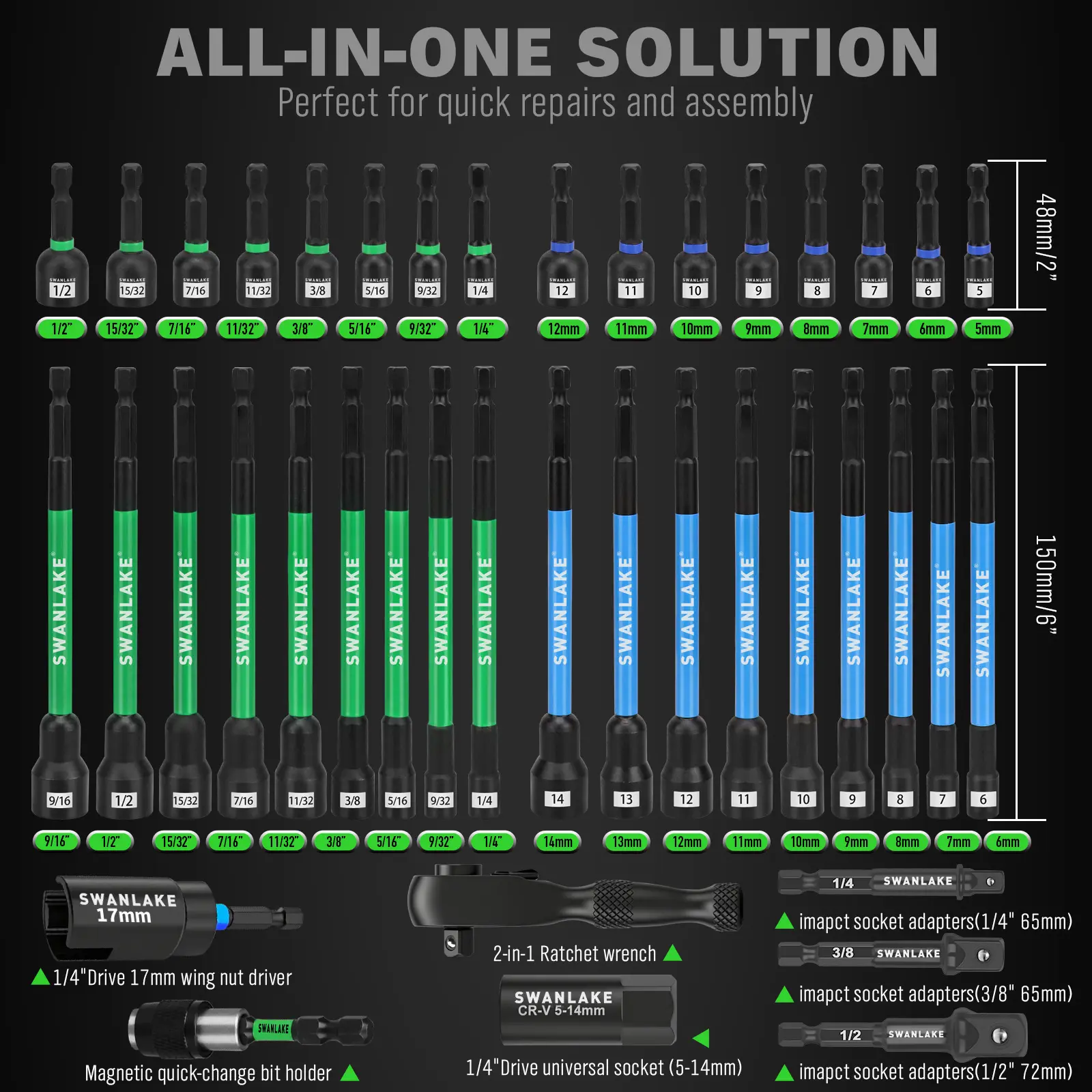 ·COMPREHENSIVE SELECTION - Includes Metric & SAE nut drivers, 2-in-1 ratchet handle, 1/4" quick-change extensions, and a universal socket - ready for any automotive, electrical, or mechanical task