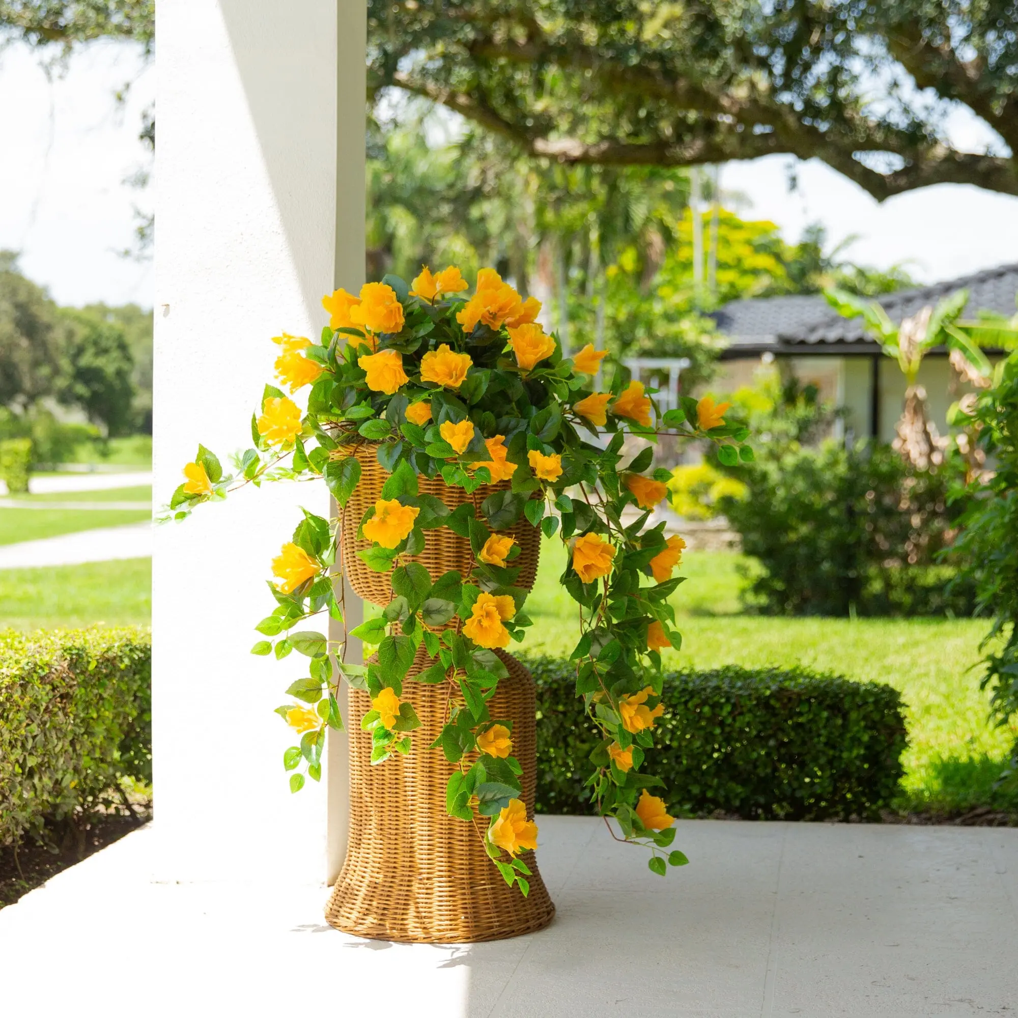 Stop dreaming of a Floridian vacation and bring home the colors of summer with this 41-In UV resistant hibiscus hanging plant set of 2. Like a photo from a dreamy sun-kissed beach, each bush has flowers in vibrant shades accented by green leaves for a verdant mix of hues. From front porches during summer to cozy indoors nooks, this set is great for both indoor and outdoor use. DIY and style in your favorite vase or planter and add to your pool deck, backyard, entryway or bedroom. Shape the branches and fluff petals for a full look and get your dream style effortlessly.