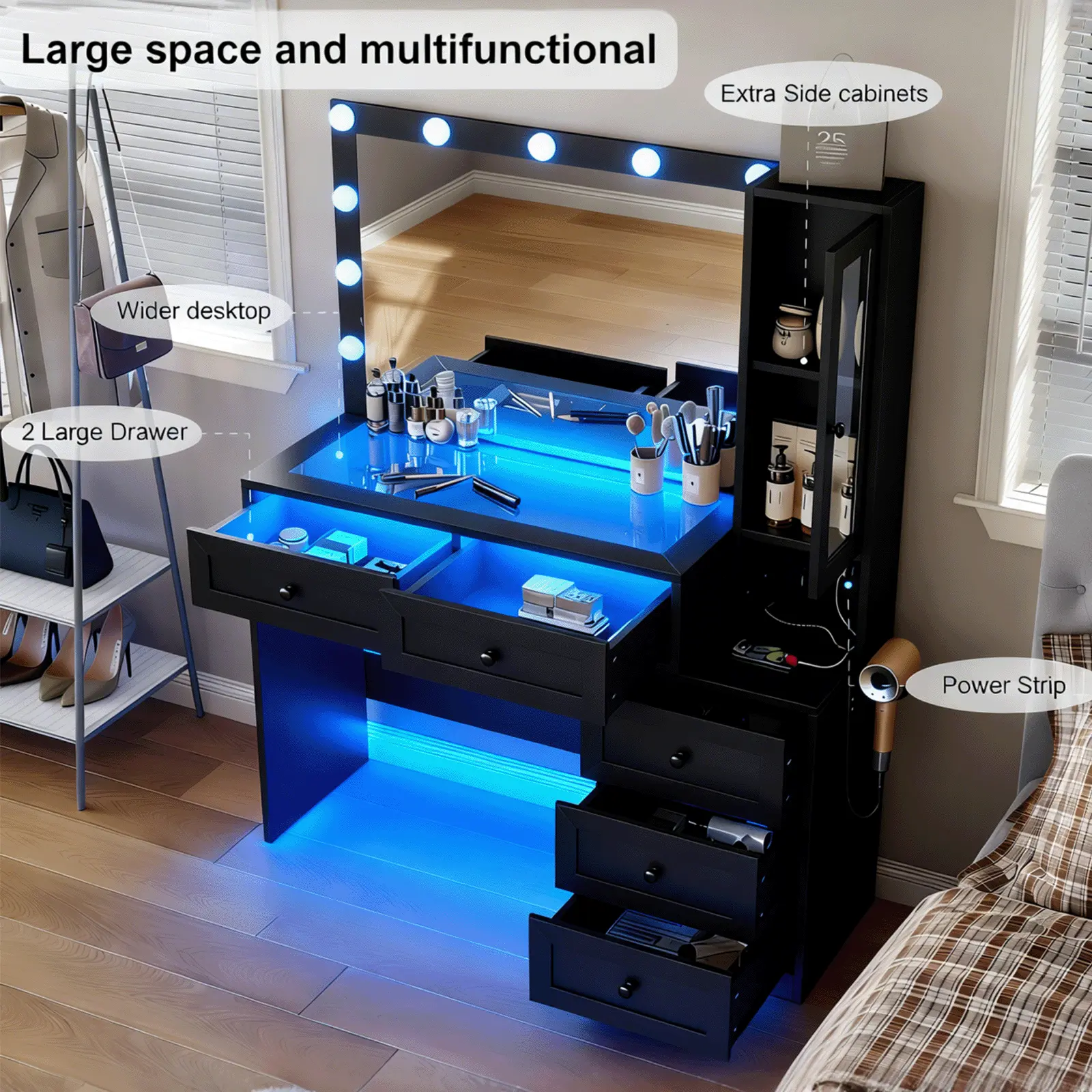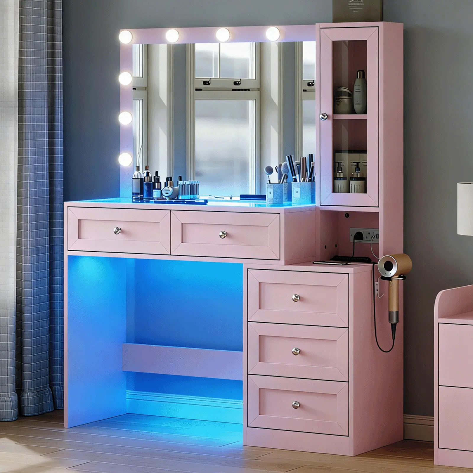 ·【Built-in Charging Station】Upgrade design! This vanity table add 2 standard plug sockets and 1 USB ports and 1 Type-C ports, If there’s a reassuring charging station, to let you charge your phone, computer and other electronic devices at the same time, you can enjoy the entertainments or the vlogs of the makeup bloggers when you do your skin care or makeup yourself, and never need to worry about that the mobile device is going to out of power.