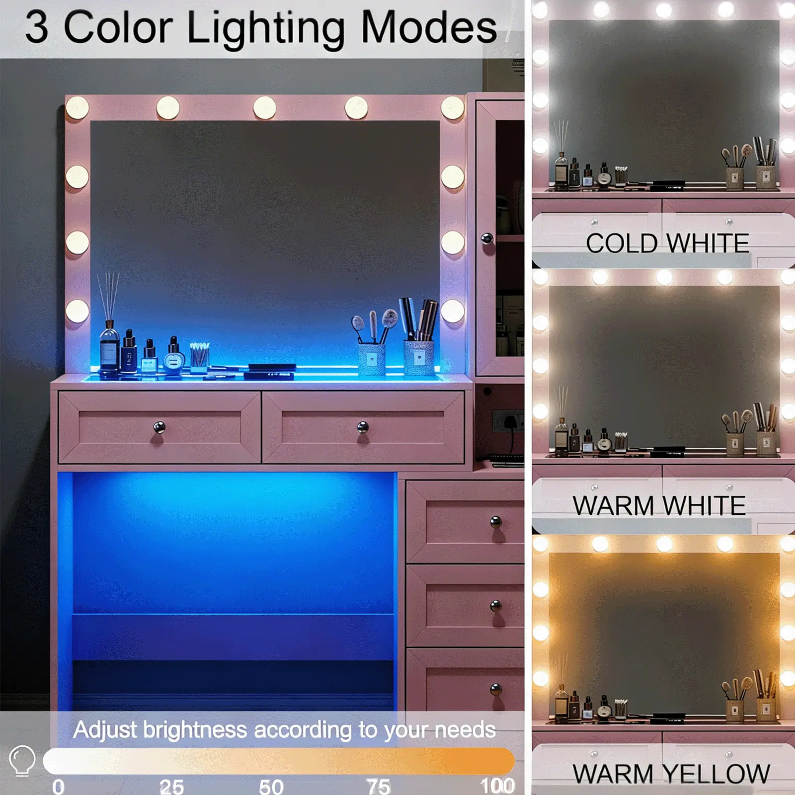 ·【 Color and Brightness Adjustable Lights 】The vanity table is designed with a big mirror with 11 light bulbs with 3 color modes, touch the switch to change the lighting color easily, conditions for you to feel the makeup environment of a high-end, You will feel like a queen every morning and night as wearing makeup or combing hairs for you and easy to apply beautiful makeup.