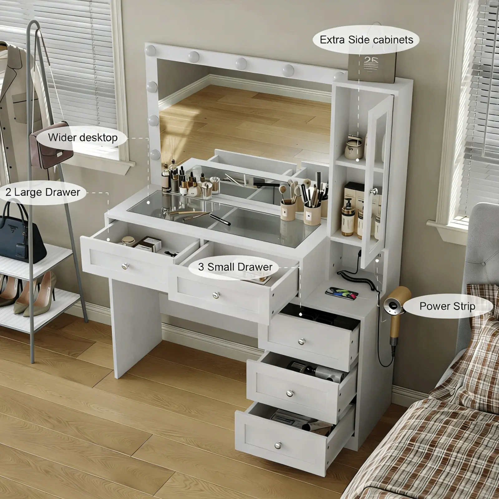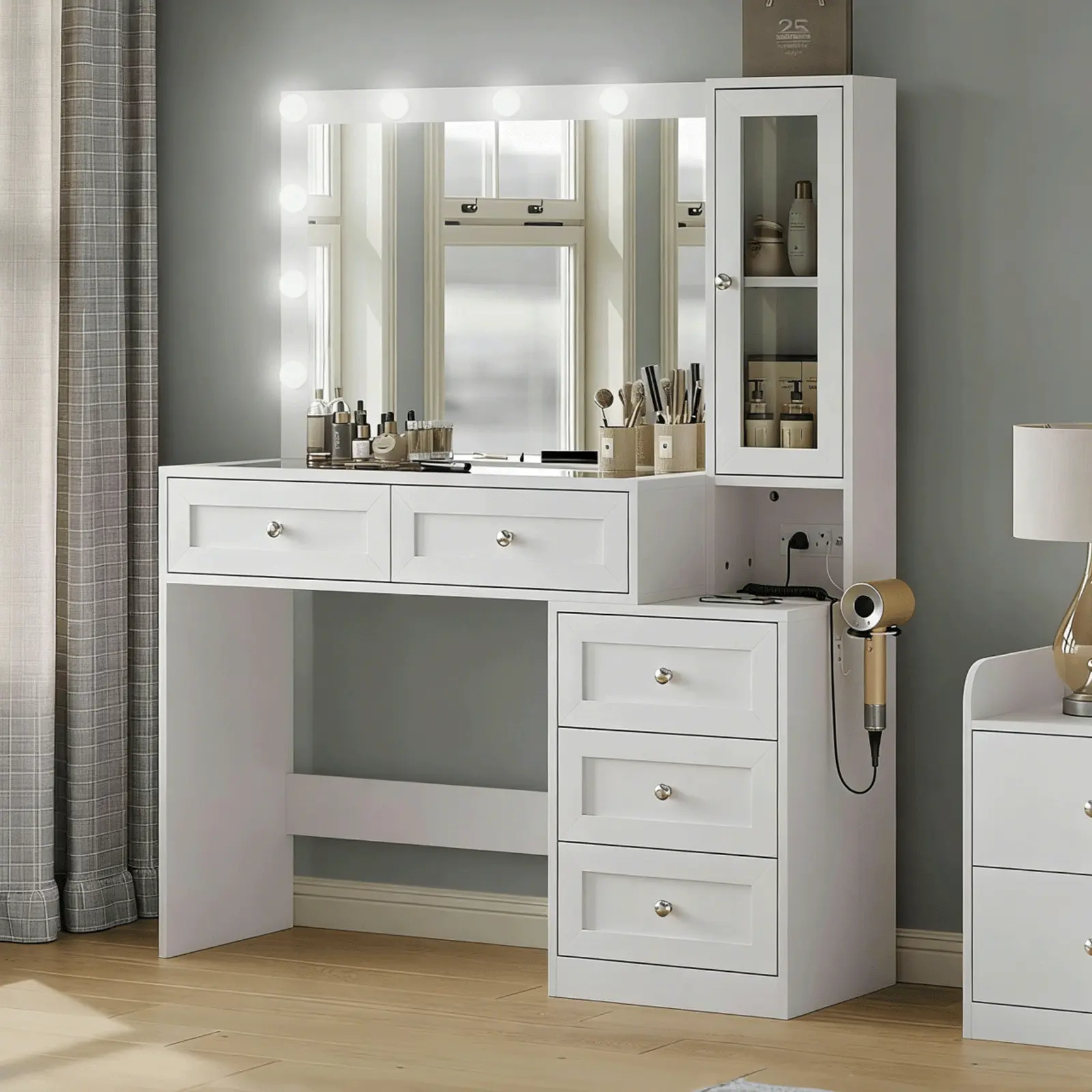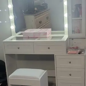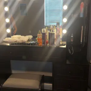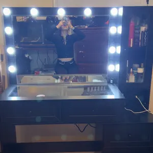 love this vanity soo much it’s beautiful i got it as a christmas gift and i couldn’t be more happier there’s plenty of drawers for makeup , hair accessories, perfume lotions , skin care every thing !! even the light modes are great plus it has outlets 😍( chair was bought separately in picture)