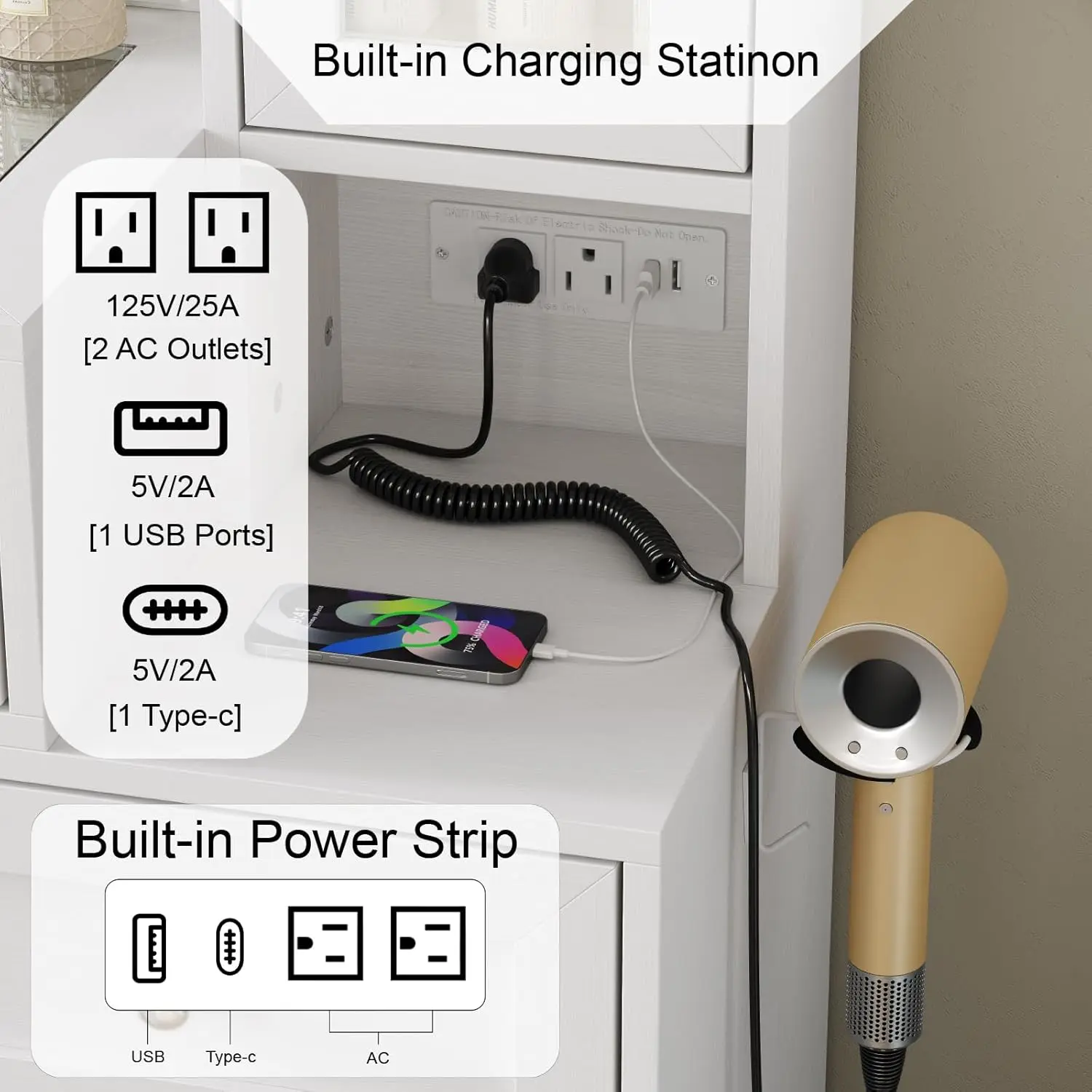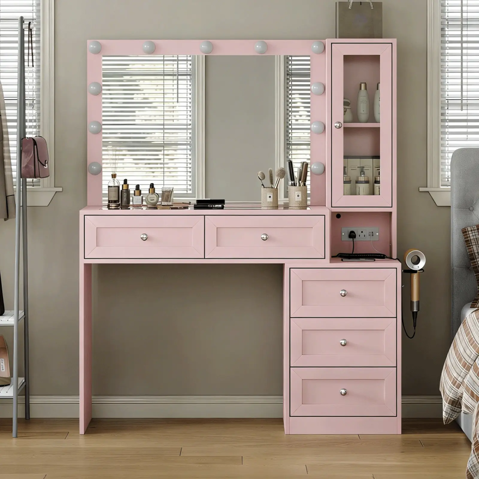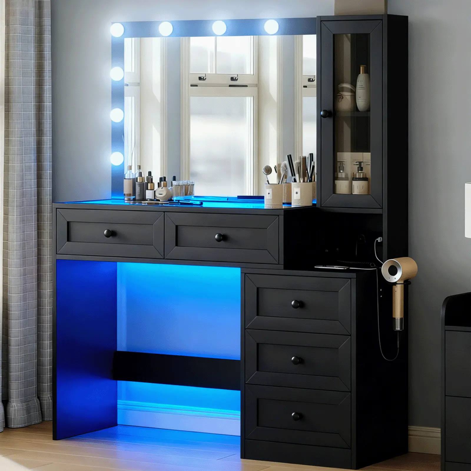 love this vanity soo much it’s beautiful i got it as a christmas gift and i couldn’t be more happier there’s plenty of drawers for makeup , hair accessories, perfume lotions , skin care every thing !! even the light modes are great plus it has outlets 😍( chair was bought separately in picture)