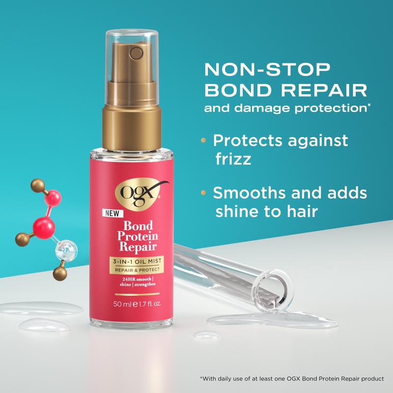 Bond Protein Repair 3-in-1 Oil Mist: Lock in shine, tame frizz, and strengthen your hair with the OGX 3-in-1 Bond Protein Repair Multi-Benefit Oil. This hair oil mist protects and smooths dry, damaged hair for 24 hours. The bond protein repair oil mist helps prevent breakage, letting you achieve healthy-looking and resilient hair.