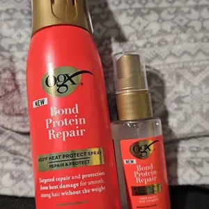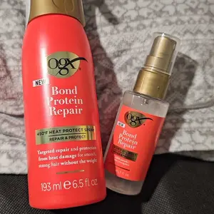 Protect your hair from heat and help maintain shine with this styling duo powered by OGX Bond Protein Complex and Dual-Action Repair Technology. Simply spray Bond Protein Repair 450°F Heat Protectant mist on damp hair before you blow out, and on dry hair before curling or ironing. Elevate your hair care routine with the OGX Protein Repair Multi-Benefit Oil; shake the hair mist bottle well before use, then spray a small amount as needed on damp or dry hair.