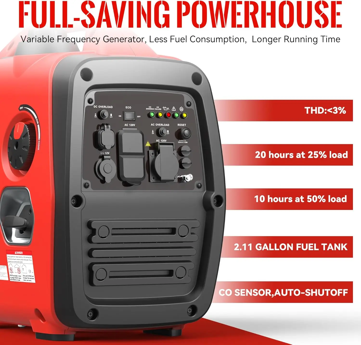 Equipped with a 1.85-gallon fuel tank, it delivers up to 22 hours at 25% load or 11 hours at 50% load.
