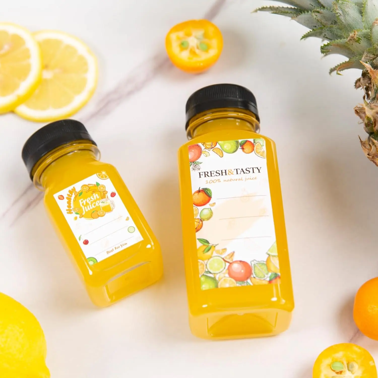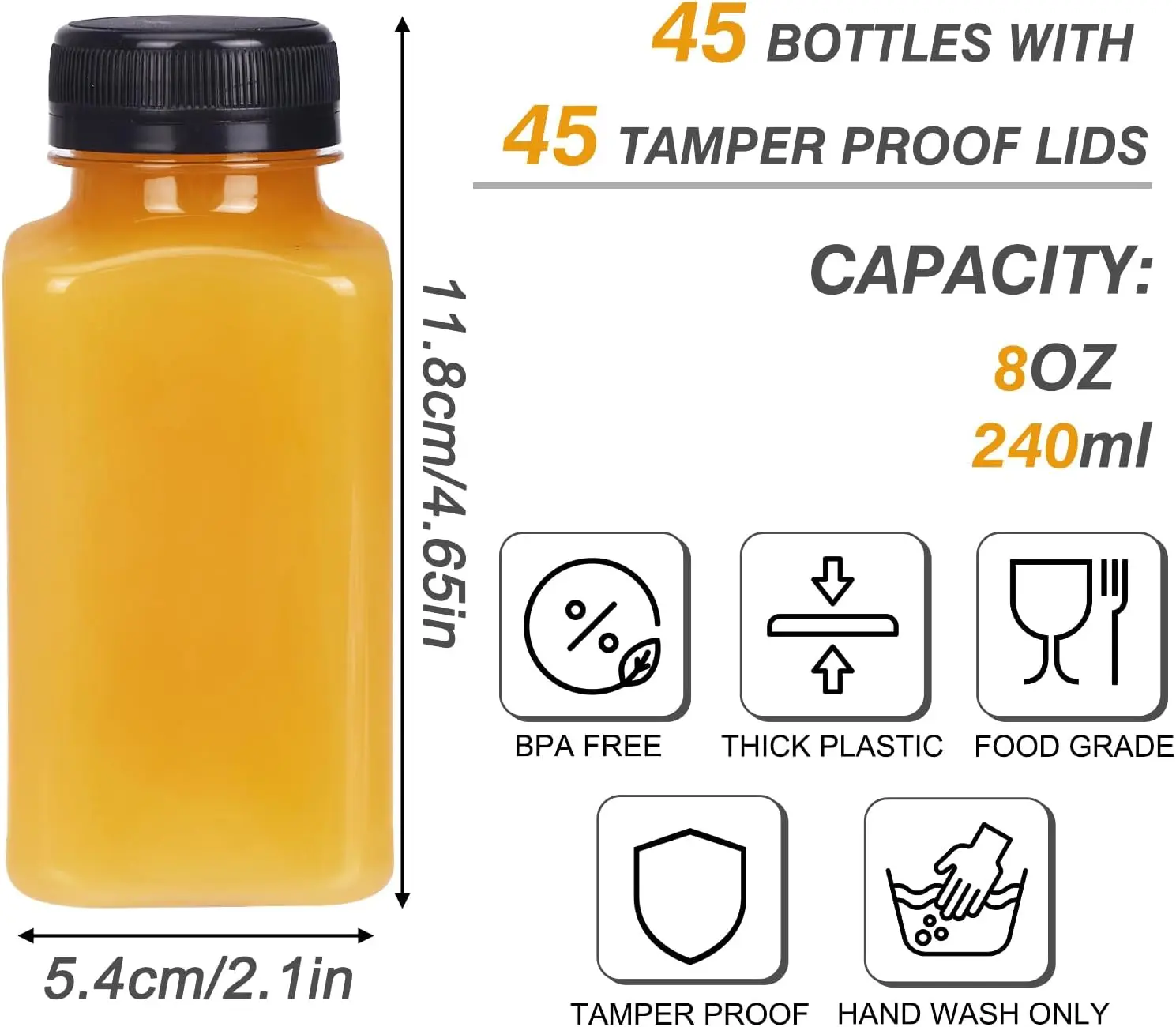·SUPER-VALUE SET: Contains 45pcs 8 oz plastic juice bottles with black tamper-evident caps. The bottle measures 2.1" x 2.1" x 4.6" , with cleaning brush, funnel and 45 labels, easy to use. The plastic juice bottle with classic shape meets your diverse needs.