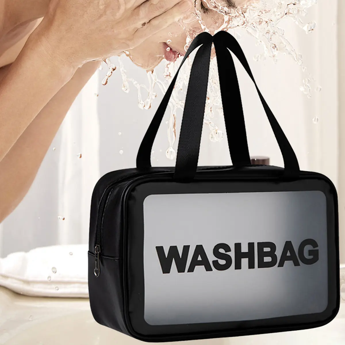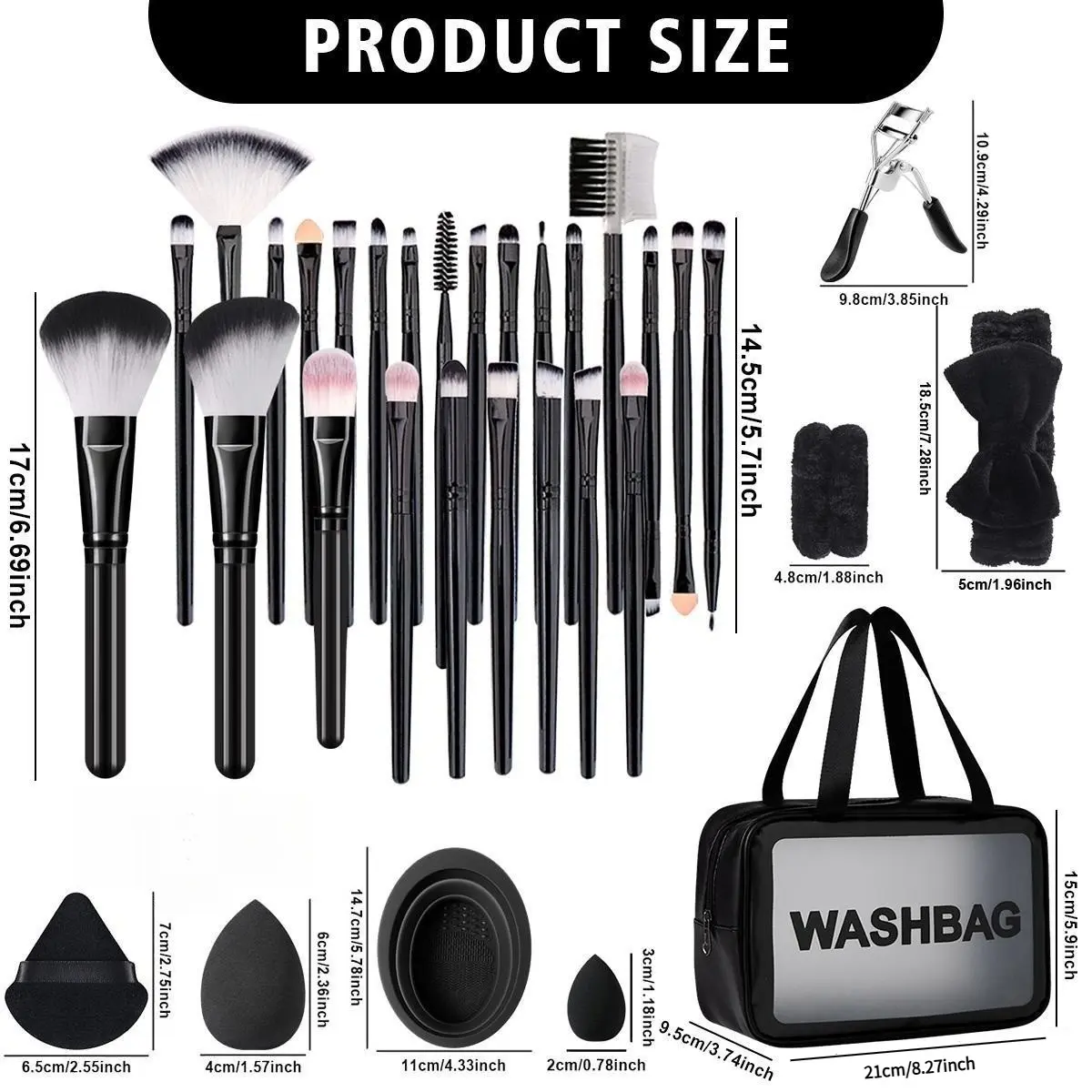 I love this set. It comes with head and wrist band so water doesn't run down your wrist. Comes cleaning sponge and a clean tray for your blushes, and different sized blenders ,powder powde.This set comes with a wash bag that you can store a these in. This set comes with 30 brushes.